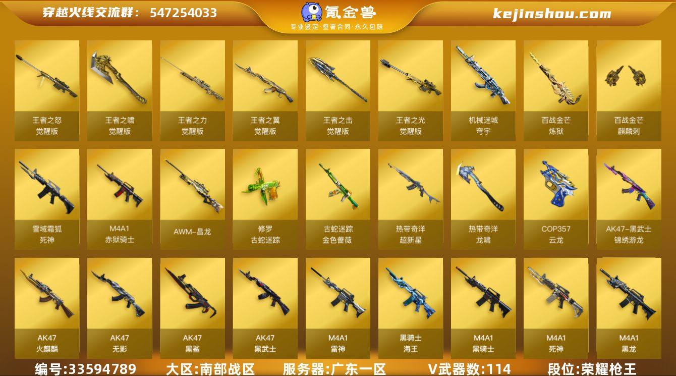 【ky6991】广东一区-126V-6王者武器数-0炫金武器数 【热门武器】:QBZ03-金色蔷薇,Scar Light-白虎,HK417-朱雀,M200-幻神*2,金色蔷薇-古蛇迷踪,修罗-古蛇迷踪,死亡之眼,Kar98K-星神,金色小号,牛牛-AK47,M4A1-黑骑士*2,汤姆逊-烈龙*6,RPK-盘龙*6,加特林-炼狱*3,斯泰尔-蝴蝶,羊驼玩偶,降世魔童,玄武-枪娘火莲,COP-白鲨,沙鹰-修罗*2,炽芒蝶刃,炽芒蝶刃-破浪逐光 皮肤,金刚伞 【音效卡】:Kar98K-星神音效卡,屠龙-电竞之星-竞星跃动音效卡,M4A1-雷神音效卡,M4A1-黑骑士音效卡,Barrett-毁灭音效卡,Barrett-极光音效卡,AWM-裁决音效卡,HK417-朱雀-电竞之星-竞星跃动音效卡,Barrett-碧霄极光音效卡,麒麟刺-百战金芒-盛典舞曲音效卡,炼狱-百战金芒-庆典舞曲音效卡,死神-雪域霜狐-怀旧音效卡,AWM-昌龙-怀旧音效卡,绝迹语音包 【皮肤】:幻神-动感闪耀 皮肤,星神-璀璨皮肤,AWM-裁决-凤灵皮肤,裁决-运输船 皮肤,裁决-胜者为王 皮肤,白虎-电玩粉兔皮肤,金色蔷薇-破浪逐光 皮肤,金色蔷薇-电竞之星 皮肤,雷神-暗月,雷神-星空,雷神-耀金皮肤,M4A1-战神赵云,雷神-宇航兔皮肤,雷神-源计划2.0专属 皮肤,雷神-诺拉 皮肤,M4A1-再燃火线,炼狱-...