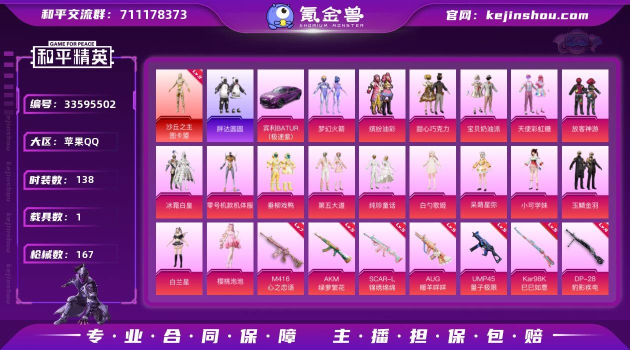 J3358 【精品红装女号】1红 17粉 11特 1载 3级图卡盟 红熊茄茄 梦幻火箭 白芍歌姬 纯珍童话 巧克力三姐妹 放客神游 小可学妹 缤纷油彩 第五大道 零号机 满级枪*6 收藏家等级68 苹果 手Q-1神装-17粉装-11特效枪-1载具-7粉色飞行器-64002热力值-10王牌印记-138套装-167枪皮 【红色神装等级】:沙丘之主-图卡盟(三级) 【红色角色神装】:沙丘之主-图卡盟 【热门品类】:粉装-梦幻火箭,粉装-缤纷油彩,套装-胖达圆圆,套装-龟仙人,套装-糯粉咩咩,套装-软软马卡龙,套装-红熊茄茄 【粉色套装】:粉装-甜心巧克力,粉装-宝贝奶油派,粉装-天使彩虹糖,粉装-梦幻火箭,粉装-缤纷油彩,粉装-放客神游,粉装-冰霜白皇,角色-零号机款机体服,粉装-垂柳戏鸭,粉装-第五大道,粉装-纯珍童话,角色-白勺歌姬,角色-呆萌星弥,角色-小可学妹,粉装-玉鳞金羽,角色-白兰星,角色-樱桃泡泡 【粉色枪皮等级】:AKM-绿萝繁花(五级),SCAR-L-纯梦嫁纱(四级),SCAR-L-锦绣绵绵(五级),M416-心之恋语(七级),M416-电玩时刻(四级),M416-墨龙九天(三级),AUG-暖羊咩咩(五级),UMP45-量子极限(五级),Kar98K-巳巳如意(五级),Mk14-樱桃泡泡(二级),DP-28-豹影疾电(四级) 【粉色载具】:宾利BATUR...