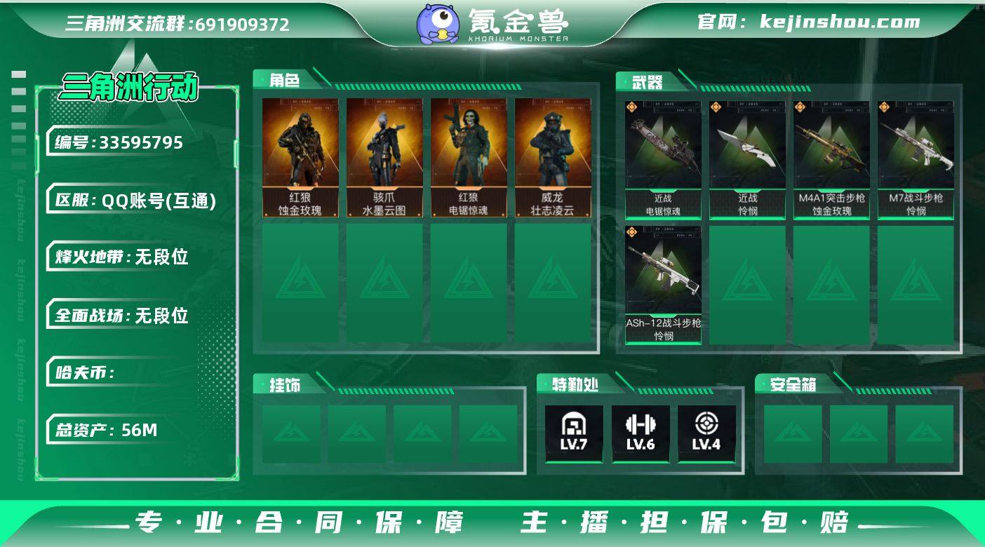 ABC10786/QQ区/可二次/钱包无法注销/【总资产:56.6M+近战怜悯影锋电锯+Vector冲锋枪-美杜莎(优品A)+SCAR-H战斗步枪-电玩高手(优品B)+SCAR-H战斗步枪-电玩高手(优品C)+Vector冲锋枪-美杜莎(优品C)+骇爪水墨云图+红狼蚀金玫瑰+威龙壮志凌云+红狼电锯惊魂】哈夫币:206W,武器皮肤173;烽火60级:钻石Ⅲ,战场:暂无段位,【安全箱】基础安全箱;【特勤处等级】仓库LV.7,靶场LV.4,训练中心LV.6;【捆绑包6】怜悯捆绑包,电锯惊魂捆绑包,蚀金玫瑰捆绑包,水墨云图捆绑包,电锯惊魂干员捆绑包,捞点薯条捆绑包;【干员皮肤4】骇爪水墨云图,红狼蚀金玫瑰,威龙壮志凌云,红狼电锯惊魂;【典藏皮肤】Vector冲锋枪-美杜莎(优品A),SCAR-H战斗步枪-电玩高手(优品B),SCAR-H战斗步枪-电玩高手(优品C),Vector冲锋枪-美杜莎(优品C);【近战皮肤】近战武器-怜悯,近战武器-影锋,近战武器-电锯惊魂,近战武器-黑鹰;【步枪皮肤】SCAR-H战斗步枪-电玩高手,M4A1突击步枪-阿米娅,M4A1突击步枪-蚀金玫瑰,ASh-12战斗步枪-怜悯,M7战斗步枪-怜悯,SG552突击步枪-运动员,SCAR-H战斗步枪-启航,SCAR-H战斗步枪-水墨云图,SCAR-H战斗步枪-铁艺苍穹,G3战斗步枪-骑士,CAR-1...