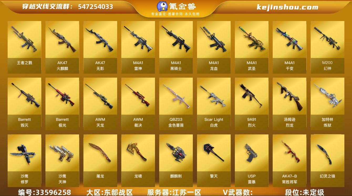 实名: 不可修改 V武器: AK47-火麒麟,AK47-无影,M4A1-雷神,M4A1-黑骑士,M4A1-龙血,M4A1-武圣,M4A1-千变,Barrett-毁灭,Barrett-极光,AWM-天龙,AWM-裁决,M200-幻神,QBZ03-金色蔷薇,Scar Light-白虎,9A91-烈火,汤姆逊-烈龙,加特林-炼狱,沙鹰-修罗,沙鹰-天神,屠龙,龙啸,麒麟刺,擎天,USP-雷暴,AK47-B-常胜将军,幻灵之锋,AK47-B-战士,AK47-B-战神,AK-47-猩红传说,唐刀神工天巧,烈火-动感闪耀,天神-动感闪耀,屠龙-动感闪耀,AK47-B-身先士卒,无影-神兵利器,AK47-竞魂无影,屠龙-斗烈龙驹,天罚-斗烈龙驹 王者武器: 王者之戮,王者之势-觉醒版,王者之翼-觉醒版,王者之锋-觉醒版 热门武器: 天龙-曼陀罗 狙击枪稀有皮肤: 毁灭耀金皮肤,裁决-胜者为王,幻神-KZ-CFPLS25冠军,极光-掌火灵耀 皮肤 英雄角色: 王者玲珑,葵,鹰,荒漠琉璃,机械姬,斗烈龙骑,神威莲华,团团 音效道具: M4A1-雷神音效卡,Barrett-极光音效卡,M4A1-黑骑士音效卡,烈火动感闪耀音效卡