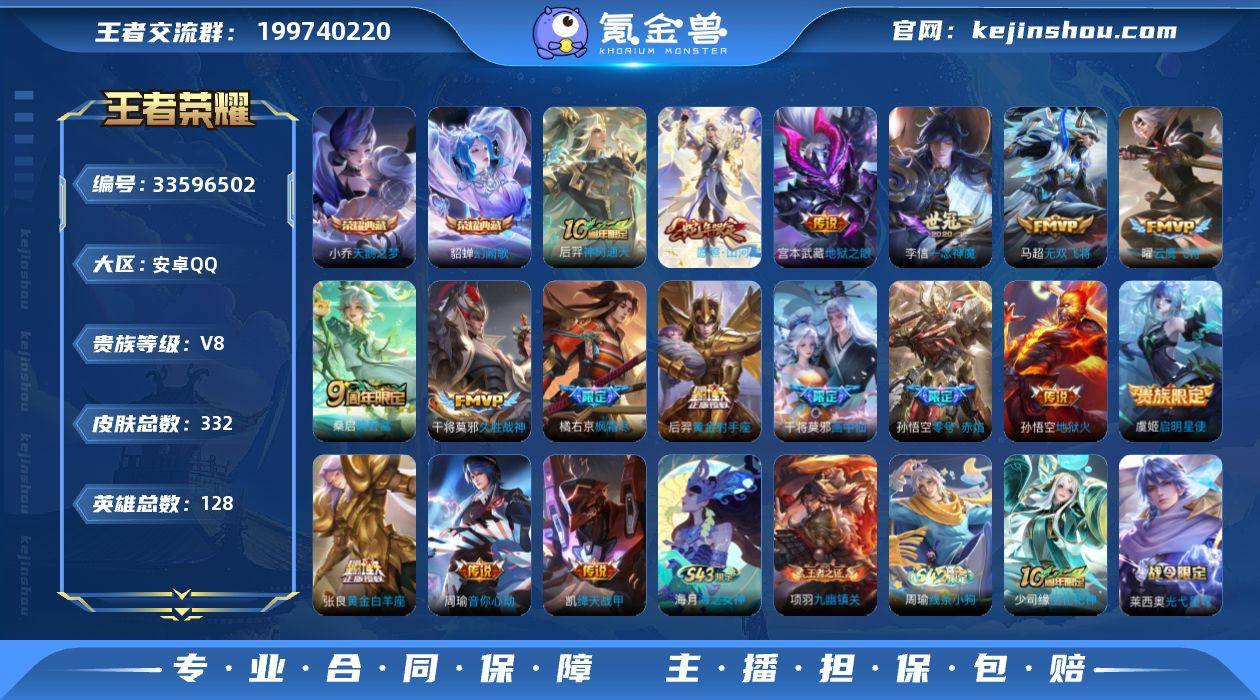 实名: 可修改 性别: 男号 贵族等级: V8 英雄数: 128 皮肤数: 332 荣耀水晶: 天鹅之梦,幻阙歌 传说皮: 黄金射手座,云鹰飞将,绛天战甲,黄金白羊座,久胜战神,一念神魔,地狱火,零号·赤焰,地狱之眼,音你心动-周瑜,无双飞将,画中仙,神树通天 限定皮: 冰锋战神,遇见飞天,李小龙,游园惊梦,梁祝,御风骁将,神威,乒乒小将,青春决赛季,天狼狩猎者,冰霜恋舞曲,逐梦之星,逐梦之影,美猴王,青龙志,朱雀志,至尊宝,圣诞老人,匿光追影者,傲雪梅枪,枫霜尽,五谷丰年,鸣野蒿,愿照·山河定 亮点: 【优质装备】:天鹅之梦(小乔典藏),幻阙歌(貂蝉典藏),黄金射手座,云鹰飞将(小将军),绛天战甲(鸡嘴战神),黄金白羊座,久胜战神,一念神魔,地狱火,零号·赤焰,地狱之眼,音你心动-周瑜,无双飞将,画中仙