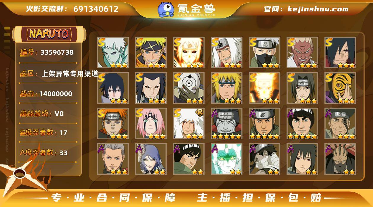 V0账号1400万战力,豹子区3333。买到就是赚到,高招近期基本都有。账号还有一万多金币,带土已出。霸体已到十级,马上150级,可小刀。