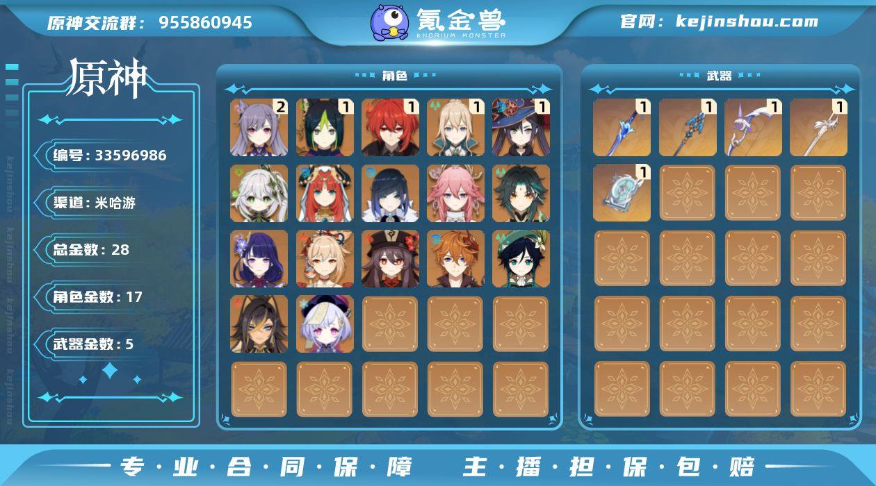 56级/28黄/女主/17个五星角色/5个五星武器/二命刻晴/纳西妲/雷电将军/夜兰/温迪/达达利亚/宵宫/八重神子/一命莫娜/胡桃/魈/一命琴/一命提纳里/妮露/一命迪卢克/迪希雅/七七/波乱月白经津/四风原典/息灾/风鹰剑/阿莫斯之弓