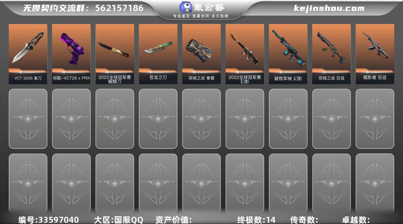 【kywwqy21】【套装】:2022全球冠军赛套装,VCT 2026 赛季套装,《双城之战》收藏套装 【英雄】:炼狱,暮蝶,捷风,雷兹,不死鸟,贤者,猎枭,芮娜,奇乐,尚勃勒,霓虹,盖可,钢锁 【近战武器】:近战武器-2022全球冠军赛 蝴蝶刀,近战武器-荆刺链刃,近战武器-VCT 2026 篆刀,近战武器-5周年//公测重制版 苍龙之刃,近战武器-紫金爪刀,近战武器-双城之战 拳套,近战武器-天御刀 【狂徒】:狂徒-双城之战,狂徒-噬影者,狂徒-荆刺圣骸 【幻影】:幻影-2022全球冠军赛,幻影-破败军械 【骇灵】:骇灵-无限竞技 【VCT手枪】:标配-VCT26 x PRX 【卡面】:孵化小能手:破壳鸭 卡面,Clutch 卡面,无畏契约GO!第一卷:芮娜 卡面,无畏契约GO!第一卷:零 卡面,《双城之战》金克丝 卡面,钢锁vs盖可 卡面,代号红色 卡面,新兵报到 卡面,V契约 卡面,无畏契约 卡面 【喷漆】:孵化小能手:破壳鸭 喷漆,买装还是存钱 喷漆,胜利属于无畏契约 喷漆,GLHF 喷漆,无畏契约 喷漆 【挂饰】:孵化小能手:破壳鸭 挂饰,无畏契约GO!第一卷 零 挂饰,鱼骨头 挂饰,天外飞客 挂饰,无畏契约 纪念币 挂饰