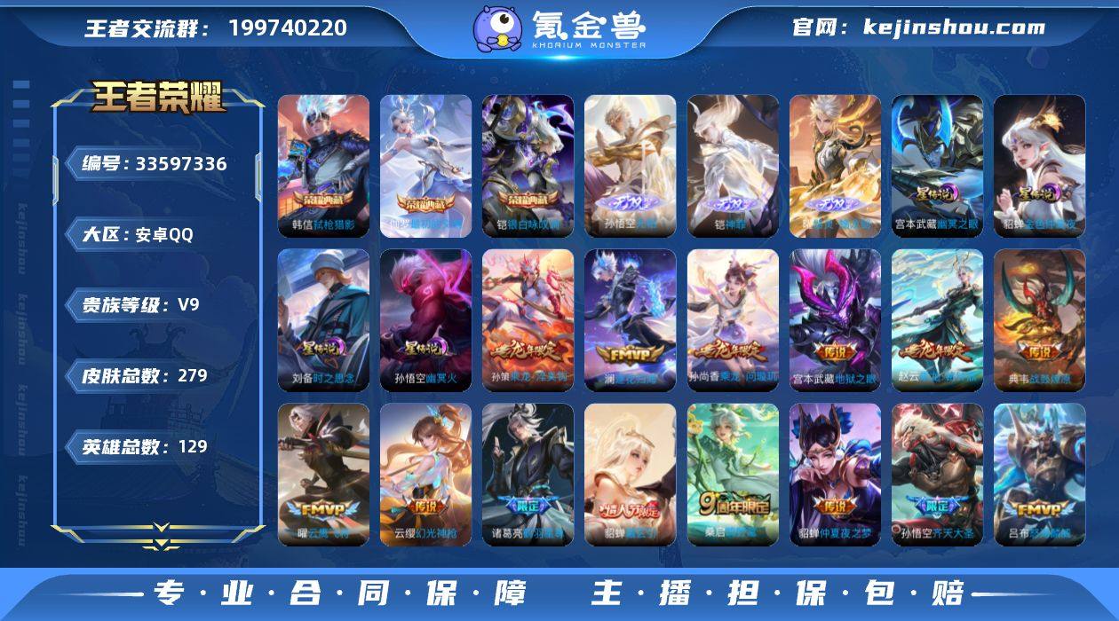MCK634256 【星天幕!无相3无双!伽罗3典藏!】 皮肤数量279 印记总数10 【V9】 【至尊星耀】 【不可修改】 账号类型3 天幕1 无双3 荣耀典藏3 星元皮肤4 传说20 史诗63 账号类型:打野号,上单号,射手号; 天幕:天幕-灿若星河; 无双:曜_器灵螭龙剑,孙悟空_无相,铠_神罪; 荣耀典藏:伽罗_最初的交响,韩信_弑枪猎影,铠_银白咏叹调; 星元皮肤:刘备_时之思念,孙悟空_幽冥火,宫本武藏_幽冥之眼,貂蝉_金色仲夏夜; 传说:孙悟空_齐天大圣,宫本武藏_地狱之眼,云缨_幻光神枪,桑启_鸣野蒿,赵云_乘龙铭钟鼎,孙尚香_乘龙问璇玑,孙悟空_地狱火,虞姬_启明星使,刘备_时之恋人,貂蝉_曦玄引,孙策_乘龙淬吴钩,典韦_战鼓燎原,铠_琥珀纪元,澜_逐花归海,吕布_怒海麟威,诸葛亮_鹤羽星尊,铠_绛天战甲,梦奇_胖达荣荣,貂蝉_仲夏夜之梦,曜_云鹰飞将; 史诗:海月_海之女神,百里玄策_热力回旋,曹操_幽灵船长,周瑜_线条小狗,项羽_九幽镇关,小乔_缤纷独角兽,百里玄策_原初追逐者,鲁班七号_电玩小子,少司缘-巫礼祀神,上官婉儿_梁祝,程咬金_功夫厨神,韩信_白龙吟,娜可露露_晚萤,黄忠-百相守梦,墨子_龙骑士,夏侯惇_乘风破浪,刘禅_鸭鸭历险记,小乔_青蛇,狂...