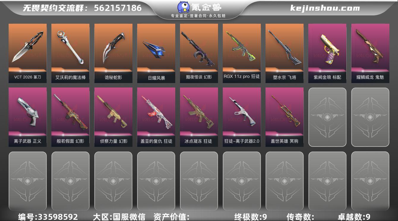 【PTWW3721】终极*9/卓越*9/皮肤*44/等级*117/段位:黄金/VCT 2026 赛季套装/幻棱/炼狱/维斯/暮蝶/钛狐/壹决/铁臂/捷风/雷兹/幽影/不死鸟/贤者/猎枭/零/芮娜/奇乐/尚勃勒/霓虹/夜露/星礈/盖可/黑梦/钢锁/VCT 2026 篆刀/紫金爪刀/艾沃莉的魔法棒/影刃/诡秘蛇影/日耀风暴/狂徒-RGX 11z pro/狂徒-冰点凝冻/狂徒-盖亚的复仇/狂徒-离子武器2.0/狂徒-诡秘蛇影/幻影-黯夜怪谈/幻影-般若假面/幻影-侦察力量/幻影-末日之翼/戍卫-折光棱晶/冥驹-盖世英雄/飞将-塑水宗/飞将-末日之翼/莽侠-诡秘蛇影/奥丁-末日之翼/判官-诡秘蛇影/蜂刺-折光棱晶/标配-紫阙金琅/标配-折光棱晶/正义-离子武器/鬼魅-耀鳞威龙/鬼魅-诡秘蛇影/短炮-末日之翼/红鳞松叶 卡面/无畏契约GO!第一卷:零 卡面/《双城之战》金克丝 卡面/别冒尖 卡面/代号红色 卡面/新兵报到 卡面/V契约 卡面/无畏契约 卡面/买装还是存钱 喷漆/胜利属于无畏契约 喷漆/GLHF 喷漆/无畏契约 喷漆/无畏契约 纪念币 挂饰