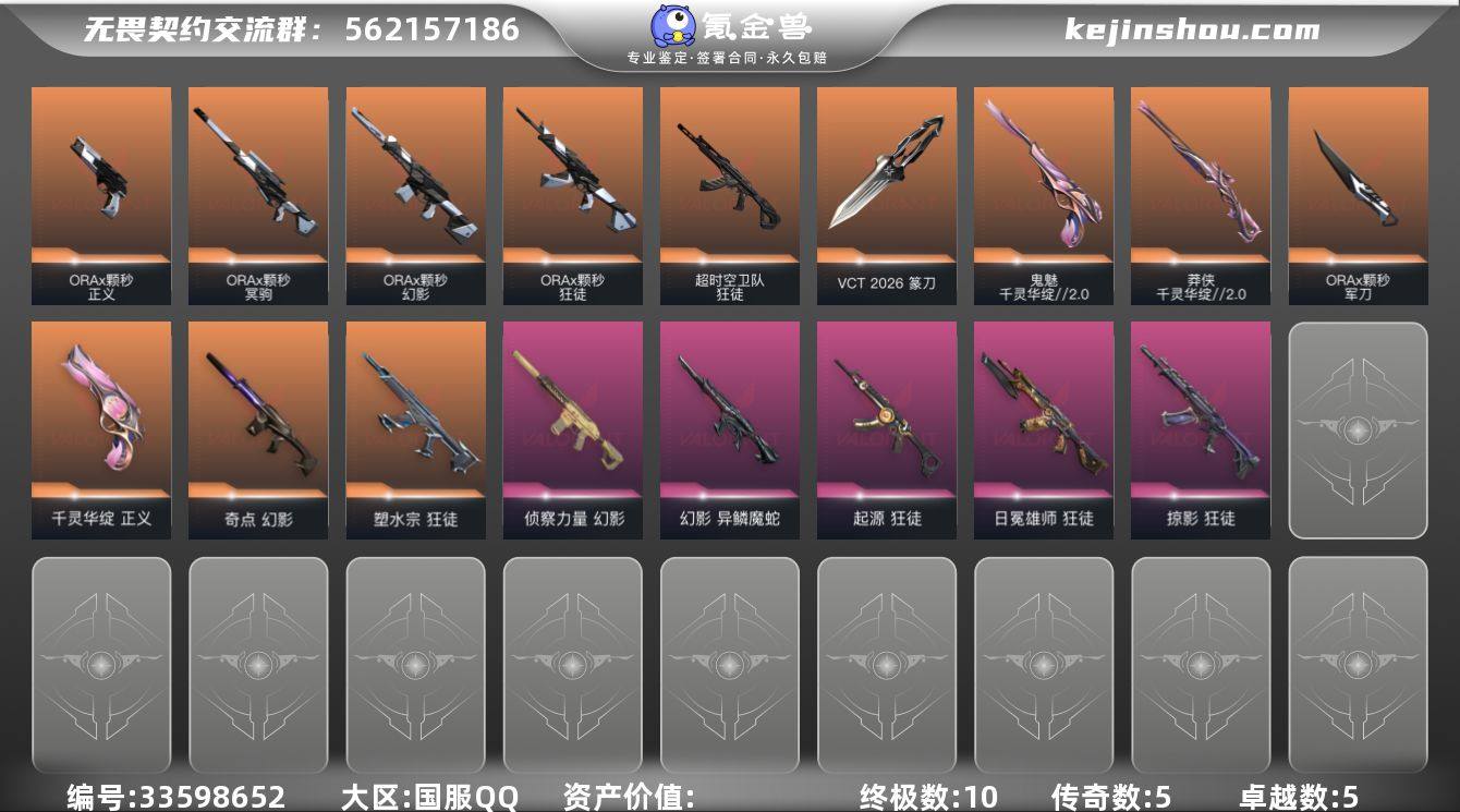 【PTWW3965】LV等级107/皮肤总价值32400/段位白银/总皮肤数量55/刀皮数量4/枪皮数量51/套装数量2/具体详情请看图/VCT 2026 赛季套装/ORAx颗秒/幻棱/炼狱/维斯/暮蝶/钛狐/壹决/铁臂/捷风/雷兹/幽影/不死鸟/贤者/猎枭/蝰蛇/零/芮娜/奇乐/尚勃勒/霓虹/斯凯/夜露/星礈/K/O/海神/盖可/黑梦/钢锁/近战武器-蒙太奇 战斧/近战武器-碎心裂刃/VCT 2026 篆刀/ORAx颗秒 军刀/狂徒-塑水宗/狂徒-ORAx颗秒/狂徒-超时空卫队/狂徒-掠影/狂徒-起源/狂徒-日冕雄师/幻影-奇点/幻影-ORAx颗秒/幻影-侦察力量/幻影-异鳞魔蛇/幻影-蒙太奇/戍卫-荆刺圣骸/冥驹-ORAx颗秒/莽侠-千灵华绽//2.0/战神-蒙太奇/骇灵-无限竞技/骇灵-蒙太奇/正义-千灵华绽/正义-ORAx颗秒/鬼魅-千灵华绽//2.0/狂怒-蒙太奇/热舞环节 卡面/正义的化身 卡面/Clutch 卡面/零点嗅探设计图 卡面/无畏契约GO!第一卷:芮娜 卡面/无畏契约GO!第一卷:零 卡面/化茧成蝶 卡面/无垠星环 卡面/无畏契约GO!第一卷:贤者 卡面/钢锁vs盖可 卡面/"Luie" 卡面/代号红色 卡面/新兵报到 卡面/V契约 卡面/无畏契约 卡面/买装还是存钱 喷漆/关门放狗 喷漆/酷熊冲浪 喷漆/放下武器 喷漆/胜利属于无畏契约 喷漆/GLHF 喷漆/无畏契约 喷漆/无畏契约GO!第...