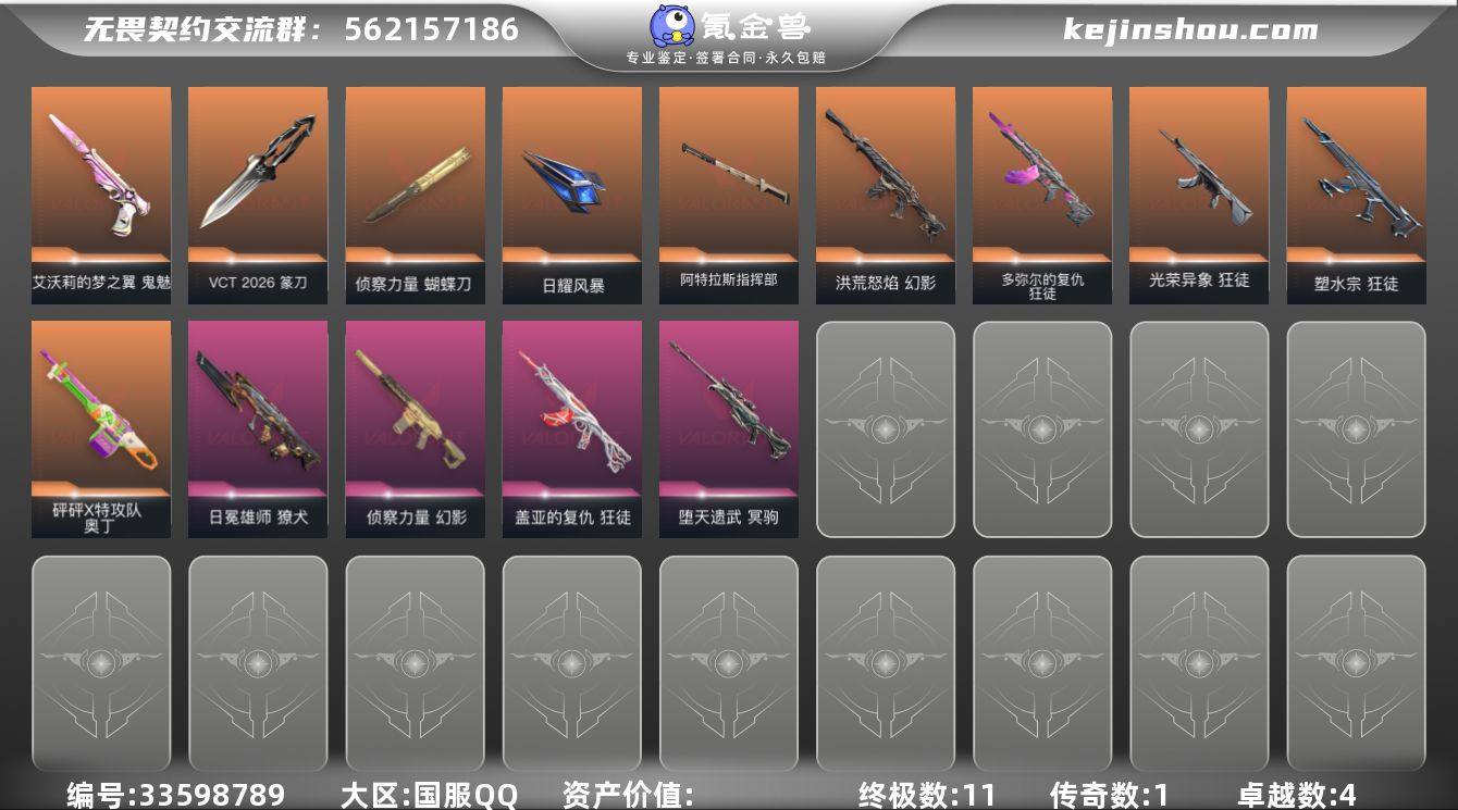【PTWW3691】LV等级96/皮肤总价值25120/段位超凡/总皮肤数量55/刀皮数量5/枪皮数量50/套装数量1/具体详情请看图/VCT 2026 赛季套装/幻棱/炼狱/维斯/暮蝶/钛狐/壹决/铁臂/捷风/雷兹/幽影/不死鸟/贤者/猎枭/蝰蛇/零/芮娜/奇乐/尚勃勒/霓虹/斯凯/夜露/星礈/K/O/海神/盖可/黑梦/钢锁/VCT 2026 篆刀/蝴蝶刀-侦察力量/剥皮小刀/日耀风暴/阿特拉斯指挥部/狂徒-塑水宗/狂徒-光荣异象/多弥尔的复仇 狂徒/狂徒-盖亚的复仇/狂徒-神罚//2.0/幻影-洪荒怒焰/幻影-侦察力量/獠犬-日冕雄师/冥驹-堕天遗武/奥丁-砰砰X特攻队/标配-神罚/鬼魅-艾沃莉的梦之翼/零点嗅探设计图 卡面/无畏契约GO!第一卷:芮娜 卡面/无畏契约GO!第一卷:零 卡面/代号红色 卡面/新兵报到 卡面/V契约 卡面/无畏契约 卡面/双击点赞 喷漆/买装还是存钱 喷漆/胜利属于无畏契约 喷漆/GLHF 喷漆/无畏契约 喷漆/无畏契约GO!第一卷 芮娜 挂饰/无畏契约GO!第一卷 零 挂饰/天外飞客 挂饰/无畏契约 纪念币 挂饰