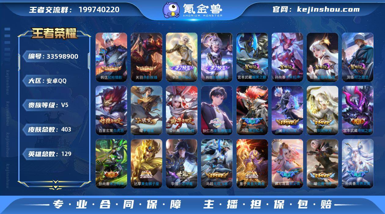 【高质量推荐·42段打野·金标阿轲·碎月剑心·韩信群星魔术团·弑枪猎影·赤影疾锋·36传说·夜礼服假面·永恒水手月亮·马超琥珀纪元·祈雪灵祝·寅虎赤拳·李逍遥·武圣·白虎志·孙尚香异界灵契·影龙天霄·黛西宝·绯月行·前尘镜·诗剑行·至尊宝·神威·可二次】w25082-安卓Q-129英雄-403皮肤-21王者印记-260铭文-贵族积分11w【贵族5】【2典藏·2无双·4星传说·36传说·1天幕·10按键】【因赛季更新游戏段付以上号为准!】 【英雄全皮】:娜可露露全皮,鬼谷子全皮,狂铁全皮,戈娅全皮 【荣耀典藏】:关羽赤影疾锋,韩信弑枪猎影 【无双皮肤】:韩信群星魔术团,李白碎月剑心 【星元皮肤】:刘备时之思念,孙尚香未来机甲,宫本武藏幽冥之眼,貂蝉金色仲夏夜 【天幕】:共赏芳华天幕 【传说皮肤】:后羿神树通天,澜愿照九州拓,云缨幻光神枪,桑启鸣野蒿,墨子黄金天蝎座,马超琥珀纪元,澜逐花归海,狄仁杰夜礼服假面,王昭君永恒水手月亮,兰陵王影龙天霄,吕布遇见神鼓,李白诗剑行,不知火舞绯月行,娜可露露前尘镜,马超无双飞将,孙策末日机甲,裴擒虎寅虎赤拳,孙尚香异界灵契,赵云淬星耀世,曜李逍遥 ,公孙离祈雪灵祝,铠绛天战甲,镜炽阳神光,虞姬启明星使,关羽武圣,曜云鹰飞将,李...