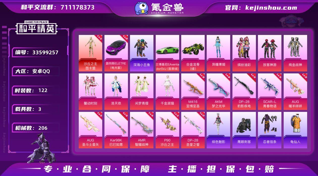 【AZH3091】安卓 手Q【二级路特斯(电光紫)三级图卡盟 猪脸馨动时刻千金淑猫放客神游 满级至情至圣M416 3载具】1神装-8粉装-14特效枪-3载具-5粉色飞行器-68988热力值-15王牌印记-122套装-206枪皮 【红色载具】:路特斯ELETRE(电光紫)(二级) 【红色神装等级】:沙丘之主-图卡盟(三级) 【红色角色神装】:沙丘之主-图卡盟 【热门品类】:粉装-缤纷油彩,套装-深海小丑鱼,套装-忍者信条,套装-龟仙人 【粉色套装】:粉装-缤纷油彩,粉装-放客神游,粉装-绚金战神,粉装-馨动时刻,角色-洛天依,粉装-闲梦青缨,角色-千金淑猫,角色-异瞳寒姬 【粉色枪皮等级】:AKM-梦之光华(六级),SCAR-L-青春物语(五级),M416-至情至圣(九级),AUG-暖羊咩咩(五级),AUG-圣斗士星矢(五级),UMP45-萌骑冒险(三级),AKS-74U-森灵之息(四级),P90-沙丘之主(三级),Kar98K-巳巳如意(五级),Mk14-福马献瑞(五级),AMR-智耀战神(四级),DP-28-圣堂之誓(二级),DP-28-豹影疾电(五级),信号枪-金乌曜日(六级) 【粉色载具】:路特斯ELETRE(电光紫),兰博基尼Aventador SVJ(翡翠绿),合金龙骨(绿) 【粉色枪皮】:AKM-梦之光华,SCAR-L-青春物语,M416-至情至圣,AUG-暖羊咩咩,AUG-圣斗士星矢,...