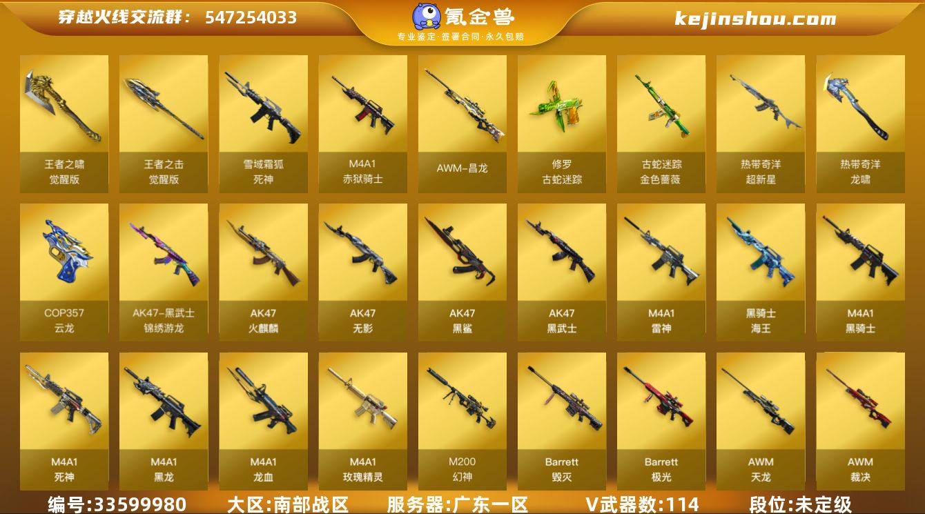 广东一区-126V-6王者武器数-0炫金武器数 【热门武器】:QBZ03-金色蔷薇,Scar Light-白虎,HK417-朱雀,M200-幻神*2,金色蔷薇-古蛇迷踪,修罗-古蛇迷踪,死亡之眼,Kar98K-星神,金色小号,牛牛-AK47,M4A1-黑骑士*2,汤姆逊-烈龙*6,RPK-盘龙*6,加特林-炼狱*3,斯泰尔-蝴蝶,羊驼玩偶,降世魔童,玄武-枪娘火莲,COP-白鲨,沙鹰-修罗*2,炽芒蝶刃,炽芒蝶刃-破浪逐光 皮肤,金刚伞 【音效卡】:Kar98K-星神音效卡,屠龙-电竞之星-竞星跃动音效卡,M4A1-雷神音效卡,M4A1-黑骑士音效卡,Barrett-毁灭音效卡,Barrett-极光音效卡,AWM-裁决音效卡,HK417-朱雀-电竞之星-竞星跃动音效卡,Barrett-碧霄极光音效卡,麒麟刺-百战金芒-盛典舞曲音效卡,炼狱-百战金芒-庆典舞曲音效卡,死神-雪域霜狐-怀旧音效卡,AWM-昌龙-怀旧音效卡,绝迹语音包 【皮肤】:幻神-动感闪耀 皮肤,星神-璀璨皮肤,AWM-裁决-凤灵皮肤,裁决-运输船 皮肤,裁决-胜者为王 皮肤,白虎-电玩粉兔皮肤,金色蔷薇-破浪逐光 皮肤,金色蔷薇-电竞之星 皮肤,雷神-暗月,雷神-星空,雷神-耀金皮肤,M4A1-战神赵云,雷神-宇航兔皮肤,雷神-源计划2.0专属 皮肤,雷神-诺拉 皮肤,M4A1-再燃火线,炼狱-玩具枪皮肤...