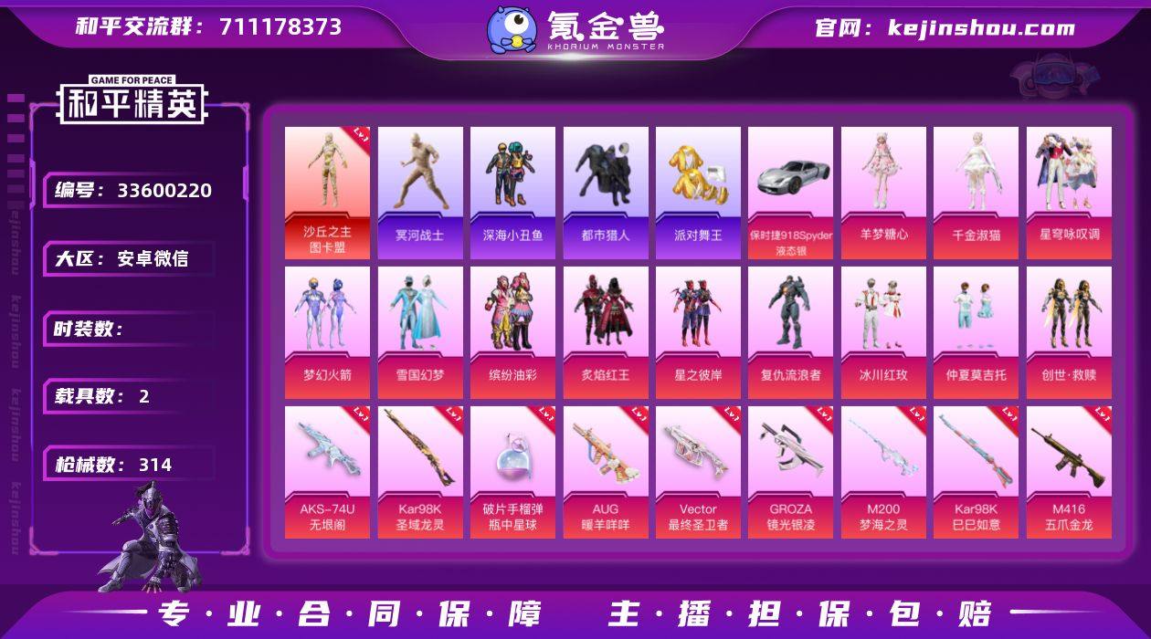 !1级图卡盟 木乃伊 金鞋 都市 雪国 猪妹 6把计数枪 番茄 哥特 满地铁天赋】c28564-【可二次】【因赛季更新游戏段付以上号为准!】 安卓V-1红装5稀有2载具13粉装27特效枪15热门189套装314枪皮 16印记 历史传奇王牌21星 【1红装】 沙丘之主-图卡盟 (1级) 【5稀有】 木乃伊 都市猎人 浪漫天命 派对舞王 派对舞王(金靴子) 【2载具】 暮色幽蹄 保时捷918Spyder(液态银) 【13粉装】 梦幻火箭 雪国幻梦 千金淑猫 异瞳寒姬 星穹咏叹调 羊梦糖心 创世救赎 缤纷油彩 仲夏莫吉托 炙焰红王 星之彼岸 冰川红玫 复仇流浪者 【27特效枪】 M416-五爪金龙 (1级) SCAR-L-锦绣绵绵 (5级) M416-心之恋语 (7级) M416-超新星 (3级) P90-沙丘之主 (3级) AKS-74U-森灵之息 (5级) AKS-74U-无垠阁 (3级) Kar98K-圣域龙灵 (1级) Kar98K-巳巳如意 (5级) Vector-最终圣卫者 (3级) MG-36-沧焰双生 (5级) DP-28-豹影疾电 (5级) AUG-暖羊咩咩 (5级) M200-梦海之灵 (2级) 蜜獾-异瞳寒姬 (4级) Mk14-盛世惊鸿 (3级) GROZA-镜光银凌 (5级) SCAR-L-童趣迷兔 (5级) UMP45-相思残雪 (7级) AKM-梦之光华 (5级) M249-绝对恒星 (4级) Mk14-福马献瑞 (5级) AA12-G-萌骑幻想 (2级) Vector-环太平洋 (1级) 燃烧瓶-...