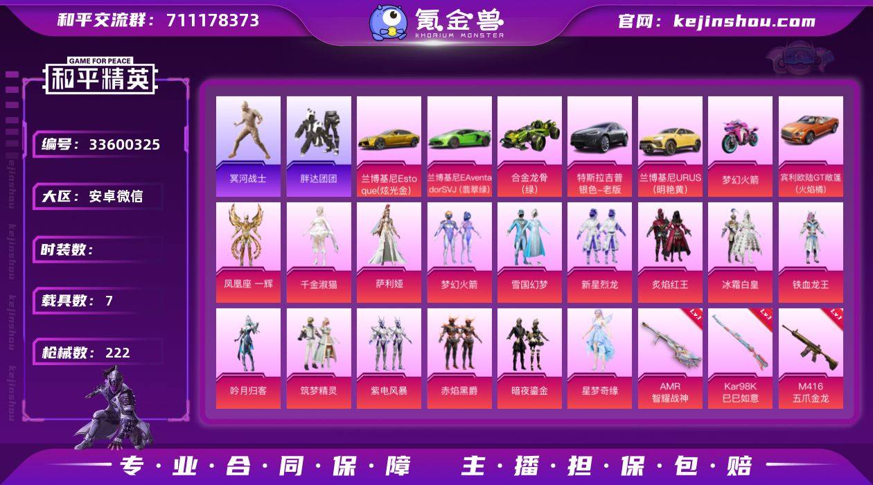 哥特】c28654-【无二次】【因赛季更新游戏段付以上号为准!】 安卓V-2稀有8载具15粉装11特效枪12热门169套装222枪皮 22印记 历史卓越王牌18星 【2稀有】 木乃伊 浪漫天命 【8载具】 兰博轿车金色 宾利欧陆GT火焰橘 兰博SUV黄色 兰博SVJ绿色 合金龙骨绿色 特斯拉X银色 双人摩托梦幻火箭 空客蔚蓝之翼僚机 【15粉装】 梦幻火箭 雪国幻梦 萨利娅 凤凰座一辉 千金淑猫 星梦奇缘 筑梦精灵 新星烈龙 暗夜鎏金 冰霜白皇 炙焰红王 紫电风暴 赤焰黑爵 铁血龙王 吟月归客 【11特效枪】 M416-五爪金龙 (7级) SCAR-L-锦绣绵绵 (5级) Kar98K-巳巳如意 (5级) DP-28-豹影疾电 (5级) AMR-智耀战神 (2级) SCAR-L-童趣迷兔 (1级) AKM-梦之光华 (7级) M249-绝对恒星 (6级) M762-冷魅冰骑 (7级) Mk14-福马献瑞 (1级) SCAR-L-机甲封神 (7级) 【12热门】 龟仙人 雪山精英 胖达团团 暗影哥特 醒狮腾龙 团圆交子 瑞龙福将 粉红小猪 狂沙舞者 破蛋小黄鸡 军刀雅典娜 M762-瑞龙福将 【3飞行器】 梦幻火箭飞行器 冷魅冰骑飞行器 天之羽翼飞行器 【4头盔】 童趣迷兔头盔 梦幻火箭头盔 雪国精灵头盔 百万伏特头盔 【4背包】 梦幻火箭背包 雪国精灵背包 甜心宝贝背包 百万伏特背包