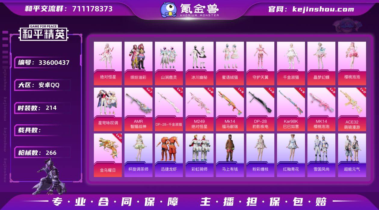 安卓 手Q-10粉装-9特效枪-0载具-5粉色飞行器-83779热力值-15王牌印记-214套装-266枪皮 【热门品类】:粉装-缤纷油彩,套装-粉红小猪,套装-红熊茄茄 【粉色套装】:角色-绝对恒星,粉装-缤纷油彩,粉装-山涧鹿灵,粉装-冰川幽秘,粉装-蜜语绒猫,角色-守护天翼,角色-千金淑猫,角色-晶梦幻蝶,角色-樱桃泡泡,粉装-星穹咏叹调 【粉色枪皮等级】:ACE32-萌骑漫游(二级),Kar98K-巳巳如意(五级),Mk14-樱桃泡泡(五级),Mk14-福马献瑞(五级),AMR-智耀战神(七级),M249-绝对恒星(六级),DP-28-千金淑猫(七级),DP-28-豹影疾电(五级),信号枪-金乌曜日(二级) 【粉色枪皮】:ACE32-萌骑漫游,Kar98K-巳巳如意,Mk14-樱桃泡泡,Mk14-福马献瑞,AMR-智耀战神,M249-绝对恒星,DP-28-千金淑猫,DP-28-豹影疾电,信号枪-金乌曜日 【粉色飞行器】:绝对恒星飞行器,炫彩糖果飞行器,脆鲨七海飞行器,月下星之子飞行器 【粉色降落伞】:绝对恒星降落伞,神秘黑猫降落伞,海渊国主降落伞,彩虹甜喵降落伞,暗夜鎏金降落伞,第五大道降落伞,蜜语绒猫降落伞,江南烟雨降落伞,冠军兔兔降落伞,鸢尾晶梦降落伞,金丰海韵降落伞,千金淑猫降落伞,盛世惊鸿降落伞,晶梦幻蝶降落伞,樱桃泡泡...