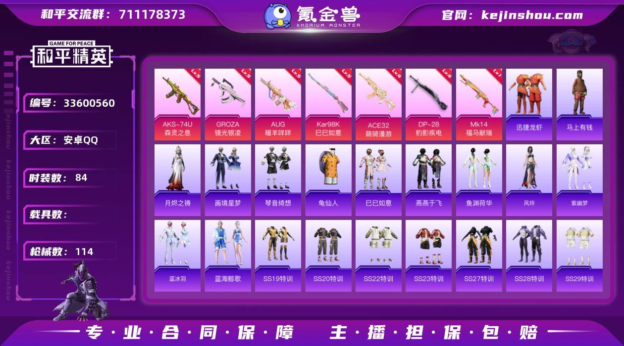 安卓 手Q-0粉装-7特效枪-0载具-1粉色飞行器-28546热力值-1王牌印记-84套装-114枪皮 【热门品类】:套装-龟仙人 【粉色枪皮等级】:GROZA-镜光银凌(五级),AUG-暖羊咩咩(五级),ACE32-萌骑漫游(四级),AKS-74U-森灵之息(五级),Kar98K-巳巳如意(五级),Mk14-福马献瑞(一级),DP-28-豹影疾电(四级) 【粉色枪皮】:GROZA-镜光银凌,AUG-暖羊咩咩,ACE32-萌骑漫游,AKS-74U-森灵之息,Kar98K-巳巳如意,Mk14-福马献瑞,DP-28-豹影疾电 【粉色飞行器】:炫彩糖果飞行器 【粉色降落伞】:金丰海韵降落伞,月影灵韵降落伞,雪月幻音降落伞,辉云木星降落伞 【稀有套装】:套装-龟仙人,套装-巳巳如意,套装-马上有钱,套装-迅捷龙虾,套装-燕燕于飞,套装-鱼渊荷华,角色-风玲,套装-紫幽梦,套装-蓝冰羽,套装-蓝海鲸歌,套装-画境星梦,套装-琴音绮想,角色-月烬之祷 【稀有枪皮】:AKM-灼热熔岩,AKM-破晓战魂,M16A4-幻世战舞者,M16A4-红色方程式,SCAR-L-夜灯,SCAR-L-红色方程式,M416-糯团青竹,M416-红色方程式,M416-蓝色火焰,M416-萌萌史莱姆,GROZA-彩虹符号,AUG-天降萌叽,AUG-耀粉歌者,QBZ-彩虹符号,M762-天降萌叽,M762-登顶巅峰,AC-VAL-天降萌叽,蜜獾-天降萌叽...