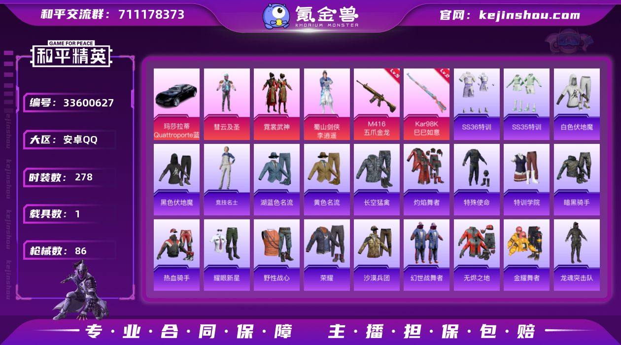 实名: 不可修改 时装数: 278 载具数: 1 枪械数: 86 战备数: 1 热门装扮: 彗云及圣,霓裳武神,蜀山剑侠-李逍遥 载具: 玛莎拉蒂Quattroporte(夜幕蓝) 稀有枪皮: M416五爪金龙,Kar98K-巳巳如意