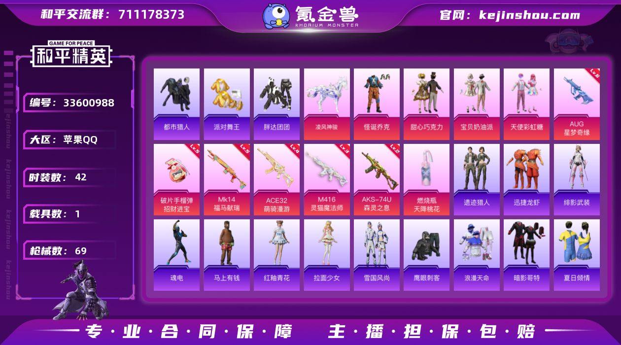 苹果 手Q-4粉装-7特效枪-1载具-7粉色飞行器-23769热力值-1王牌印记-42套装-69枪皮 【热门品类】:粉装-怪诞乔克,套装-浪漫天命,套装-都市猎人,套装-派对舞王,套装-胖达团团,套装-暗影哥特 【粉色套装】:粉装-怪诞乔克,粉装-甜心巧克力,粉装-宝贝奶油派,粉装-天使彩虹糖 【粉色枪皮等级】:M416-灵猫魔法师(三级),AUG-星梦奇缘(六级),ACE32-萌骑漫游(四级),AKS-74U-森灵之息(二级),Mk14-福马献瑞(五级),燃烧瓶-天降桃花(五级),破片手榴弹-招财进宝(五级) 【粉色载具】:凌风神骏 【粉色枪皮】:M416-灵猫魔法师,AUG-星梦奇缘,ACE32-萌骑漫游,AKS-74U-森灵之息,Mk14-福马献瑞,燃烧瓶-天降桃花,破片手榴弹-招财进宝 【粉色飞行器】:香车宝马飞行器,炫彩糖果飞行器,幻海精灵飞行器,曦光华影飞行器,极意拳锋飞行器,踏卷乘风飞行器 【粉色降落伞】:极限特训降落伞,甜心宝贝降落伞,星梦奇缘降落伞,极意拳锋降落伞,炫彩糖果降落伞,天马神君降落伞 【稀有套装】:套装-雪国风尚,套装-炫彩糖果,角色-魂电,套装-马上有钱,套装-迅捷龙虾,套装-遗迹猎人,角色-拉面少女,套装-雨过天青,套装-红釉青花,角色-绯影武装 【稀有枪皮】:AUG-冰晶雪宝,A...