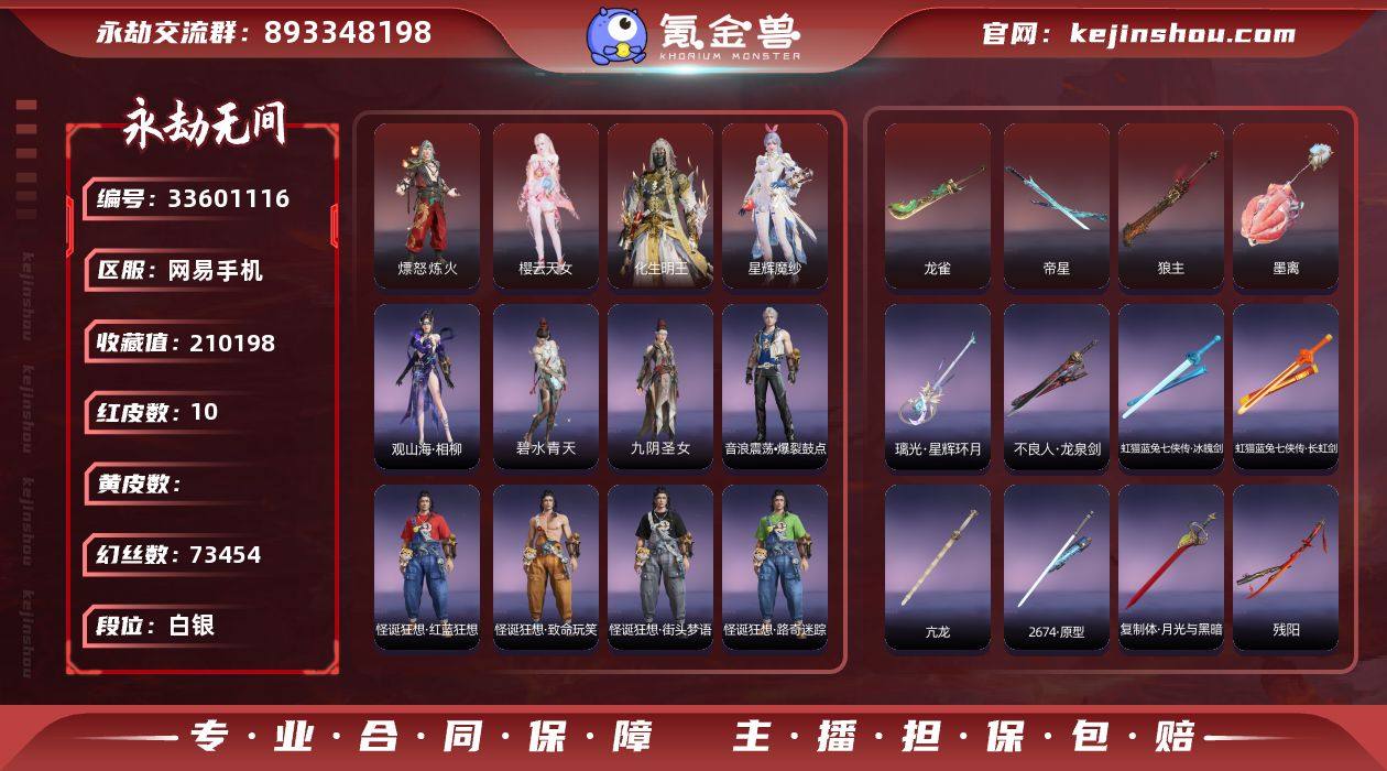 0BFQP7网易手机8个红皮,谪星·沧澜绡,奥义特效6个【神君印(岳山),赤徽(岳山),荆魂(岳山),炎烈珠(季沧海),销兵镝遗(岳山),绿野守护·竹韵悠(沈妙),】下次换绑时间2026/5/14,等待换绑期间可以登入网易大神直接进入游戏不影响游戏体验。网易支付未实名,道具货币都是默认已使用.小技能特效1个【观山海·春木(殷紫萍),】岳山2674衣服+变身器高达套装,武器红皮2个【帝星,狼主,】其他红皮6个【龙雀,星辉魔纱,樱云天女,化生明王,墨离,熛怒炼火,】劫涛·潮,春桃笑,庖丁·食神,花无痕,新魔杰·斩魔天将,孽炎祸斗,百战·破荆者,巨阙,长歌诗韵·胡旋女,千秋匠心·玉叶景,春桃笑,新魔杰·伏龙尊者,龙之影·过江龙,伏波龙女,楚韵九歌·湘夫人,逆水寒·极夜天曦,干将莫邪,护世四法·广目天王,楚韵九歌·云中君,劫涛·潮,2674·争斗洪流,咯咯,咕咕(连弩),葫芦兄弟·蛤蟆头领,封神录·申公豹,阿娜希塔,封神录·龙吉公主,封神录·姜子牙,观山海·相柳,盗墓笔记·黑金古刀,