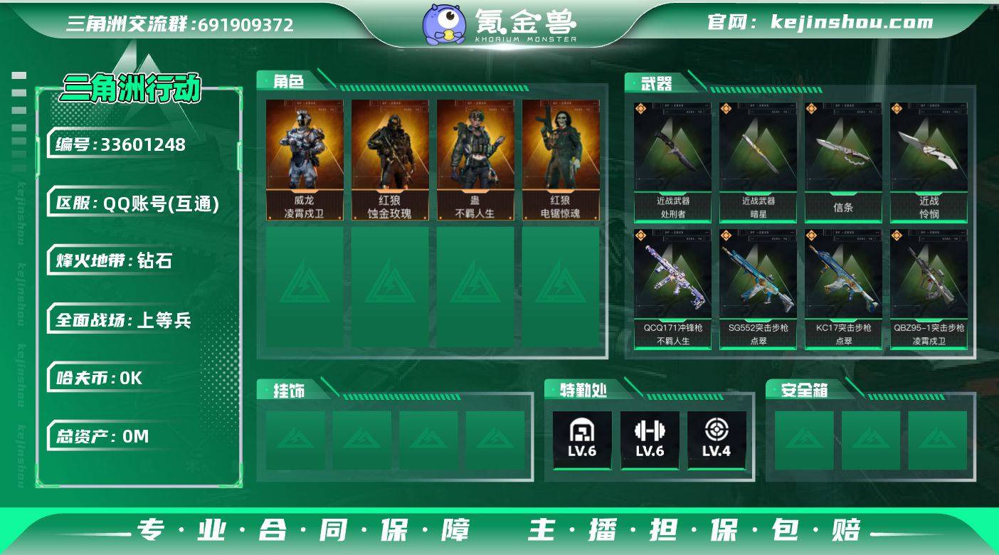 实名: 不可修改 烽火地带段位: 钻石 全面战场段位: 上等兵 总资产: 10 哈夫币: 7 干员外观: 红狼-蚀金玫瑰,红狼-电锯惊魂,威龙-凌霄戍卫,蛊-不羁人生 传说武器皮肤: M4A1突击步枪-蚀金玫瑰,近战-怜悯,SMG45冲锋枪-骑士,M4A1突击步枪-阿米娅,复合弓-黑-天际线,AWM狙击步枪-捞点薯条,腾龙突击步枪-捞点薯条,93R-捞点薯条,AK-12突击步枪-特斯拉线圈,SR-3M紧凑突击步枪-特斯拉线圈,UZI冲锋枪-特斯拉线圈,M250通用机枪-骑士之心,KC17突击步枪-电锯惊魂,腾龙突击步枪-死神玫瑰,近战-信条,SG552突击步枪-运动员,SKS射手步枪-骑士,近战-暗星,近战-处刑者,M14射手步枪-蛮荒,QBZ95-1突击步枪-凌霄戍卫,腾龙突击步枪-万金泪冠,AWM狙击步枪-万金泪冠,.357左轮-缄花,M14射手步枪-缄花,SMG-45冲锋枪-锦绣,KC17突击步枪-点翠,SG552突击步枪-点翠,QCQ171冲锋枪-不羁人生 亮点: 【优质装备】:近战-怜悯