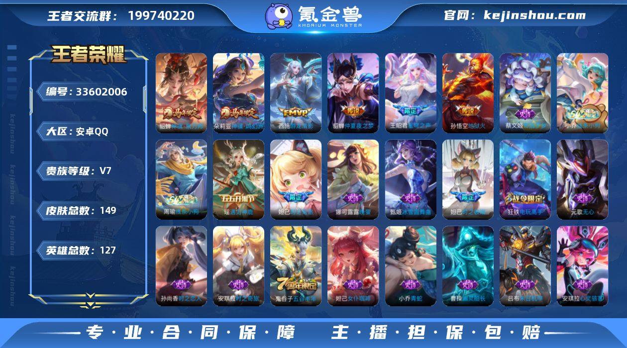 贵族等级: V7 英雄数: 127 皮肤数: 149 传说皮: 地狱火,仲夏夜之梦,游龙清影,神骥·鸣幻洲,神骥·聚万邦 限定皮: 游园惊梦,时之彼端,时之奇旅-妲己,星穹之声,五谷丰年