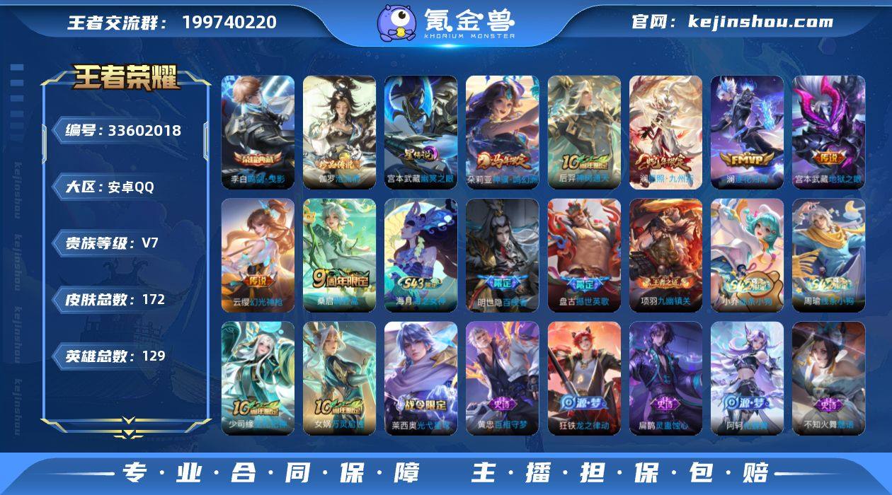 贵族等级: V7 英雄数: 129 皮肤数: 172 荣耀水晶: 鸣剑·曳影 珍品传说: 沧流箭 星传说: 幽冥之眼 传说皮: 地狱之眼,澜逐花归海,幻光神枪,神树通天,神骥·鸣幻洲 限定皮: 李小龙,鸣野蒿,愿照·九州拓