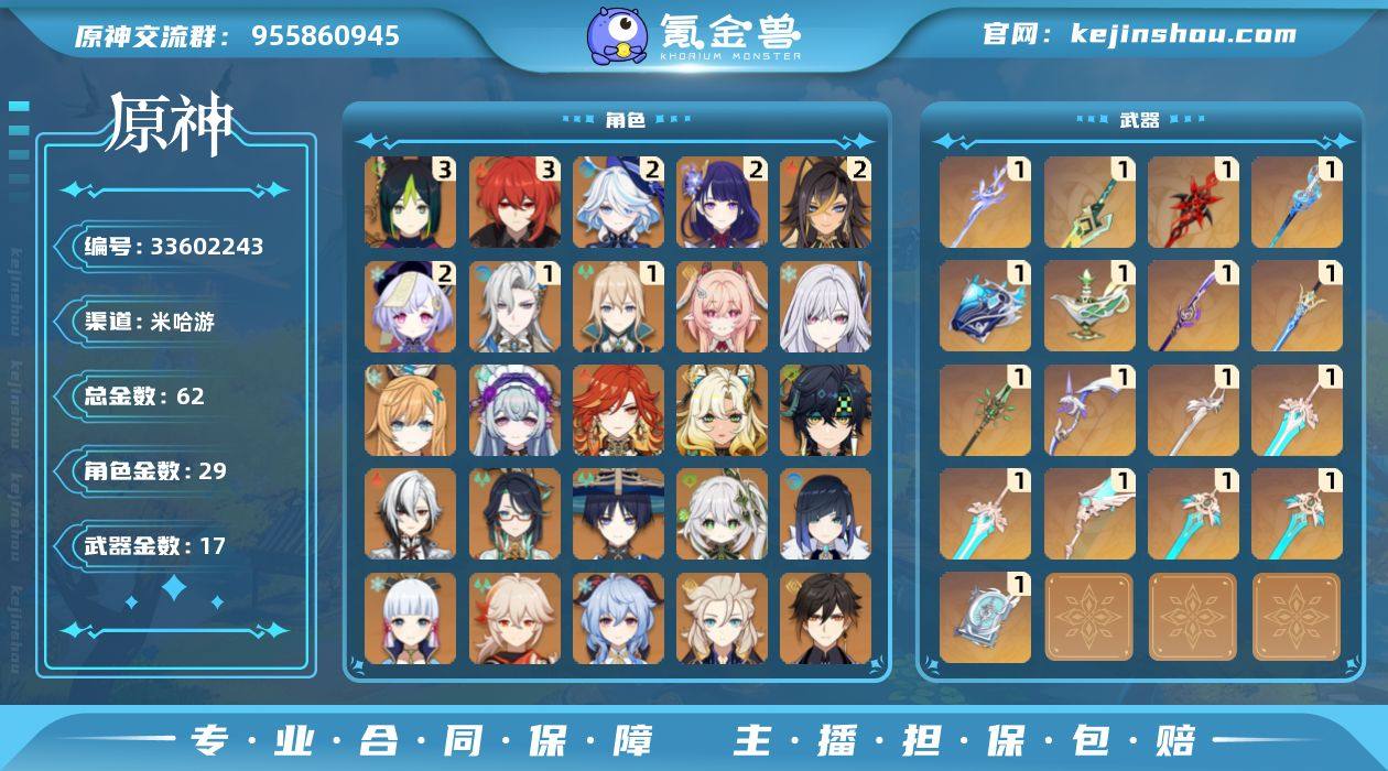 20天月卡,武器池垫了60发,角色池垫了40发,背包中有100抽,强度练度在线,主C大部分带专