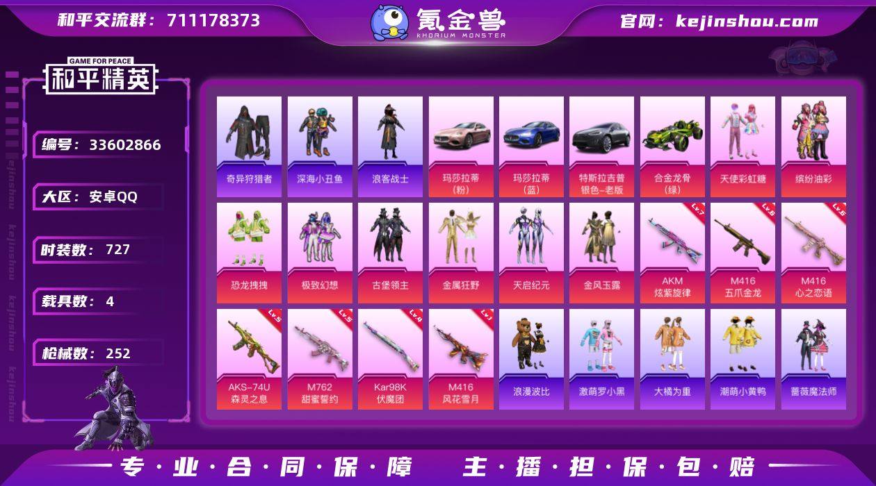 【特价出售】安卓Q-2稀有4载具9粉装10特效枪45热门184套装252枪皮 85461热力值 13印记 历史传奇王牌12星 【2稀有】 奇异狩猎者 浪漫天命 【4载具】 玛莎拉蒂蓝色 玛莎拉蒂粉色 合金龙骨绿色 特斯拉X银色 【9粉装】 天启纪元 天使彩虹糖 辉云木星 金风玉露 金属狂野 缤纷油彩 古堡领主 极致幻想 恐龙拽拽 【10特效枪】 M416-五爪金龙 (6级) M416-心之恋语 (6级) AKM-炫紫旋律 (7级) AKS-74U-森灵之息 (5级) Kar98K-伏魔团 (4级) M762-甜蜜誓约 (5级) M416-风花雪月 (1级) AKS-74U-森灵之息 (5级) Mk14-福马献瑞 (5级) UMP45-萌骑冒险 (2级) 【45热门】 奇迹天团 星光纪元 浪漫假日 雪山精英 潮萌小黄鸭 梦魇先生 鹰眼刺客 蔷薇魔法师 奇迹天团 激萌罗小黑 深海小丑鱼 大橘为重 浪漫波比 浪客战士 神秘黑猫 暗夜契约 暗影哥特 赛罗奥特曼 团圆交子 瑞龙福将 纯白誓言 狂沙舞者 漫步者 冰爽海盐 青龙圣者 粉甜马卡龙 海洋之心 机械英豪 破蛋小黄鸡 风华少年志 白月香洋装 软嫩糖心蛋 黑色刀锋 英勇保护者 M416-魔法学院 AKM-奇异狩猎者 M416-梨园星光 M762-奇异狩猎者 M762-瑞龙福将 M24-奇异狩猎者 M249-古堡领主 S686-奇异狩猎者 AUG-魔法学院 Kar98K-深海曼妙 Kar98K-古堡领主...