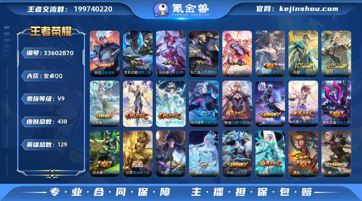 【王者荣耀连体和平精英】贵族等级: V9 英雄数: 129 皮肤数: 438 荣耀水晶: 弑枪猎影 星传说: 未来机甲,幽冥之眼,星际治安官,无限倾慕 传说皮: 黄金狮子座,黄金射手座,冠军飞将,云鹰飞将,绛天战甲,久胜战神,一念神魔,云霓雀翎,末日机甲-孙尚香,仲夏夜之梦,零号·赤焰,地狱之眼,飞鸢探春,胖达荣荣,时之恋人-刘备,淬星耀世,超时空战士-狄仁杰,末日机甲-孙策,无双飞将,山海·炽霜斩,记忆之芯,鹤羽星尊,霜月吟,澜逐花归海,乘龙·问璇玑,典韦战鼓燎原,幻光神枪,云诺千山,神树通天,纵目迁山,踏浪归 限定皮: 遇见飞天,李小龙,梁祝,时雨天司,烈魂,岱宗,奇迹圣诞,逐梦之翼,天狼狩猎者,冰霜恋舞曲,青龙志,至尊宝,圣诞老人,孙行者,傲雪梅枪,启示之音,深海之息,五谷丰年,诗剑行,山海·玄木吟,齐天大圣,无限倾心-虞姬,影龙天霄,鸣野蒿,陌上桑,逐霄战戟,愿照·众生和,愿照·山河定