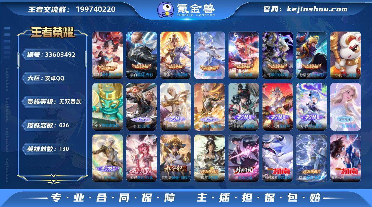 王者荣耀安卓QQ区高端号出!皮肤多到爆,英雄全齐,稀有传说、无双、限定皮肤都有,账号信息都在图里,喜欢收集皮肤的别错过~ 账号数据很牛,小国标猴子,英雄130个,皮肤626,传说101,无双10,典藏7,珍品传说5,总场次8287,皮肤覆盖度高,直接上手玩没问题