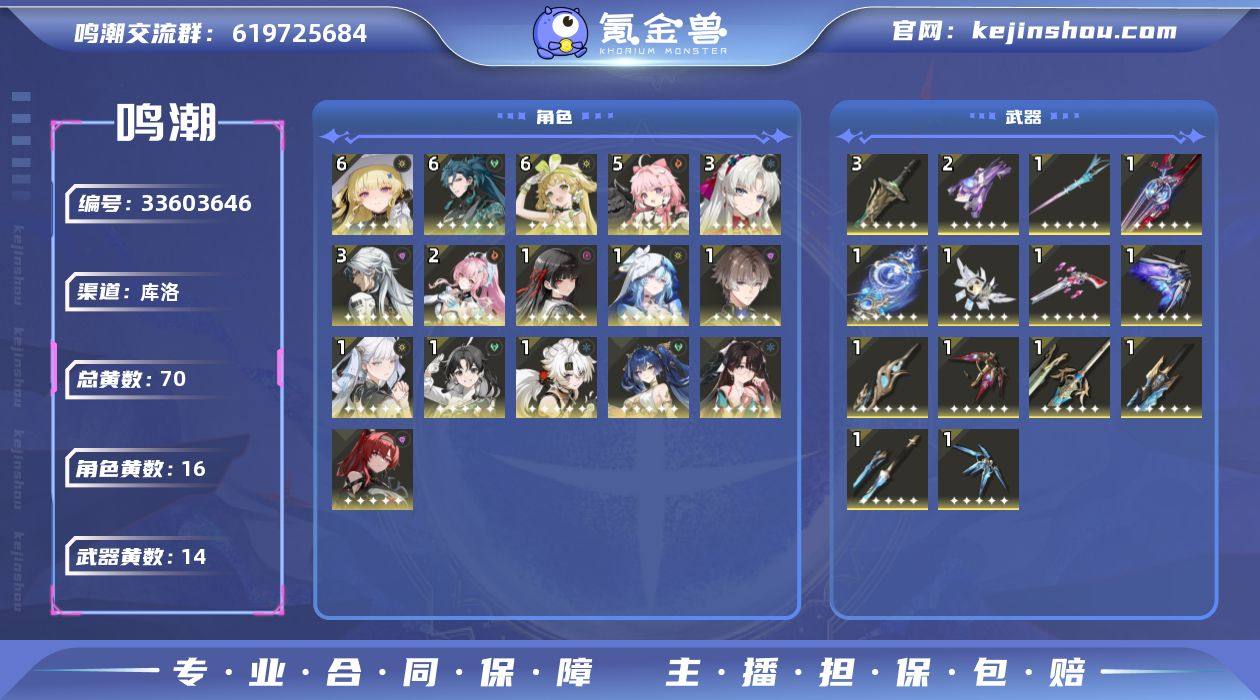 80级/70黄/男主/16个五星角色/14个五星武器 未绑定,爱弥斯,尤诺,千咲,菲比,今汐,珂莱塔,守岸人,相里要,吟霖,折枝,忌炎,维里奈,卡卡罗,鉴心,安可,凌阳,永远的启明星,昙切,万物持存的注释,血誓盟约,和光回唱,死与舞,星序协响,诸方玄枢,时和岁稔,掣傀之手,苍鳞千嶂,浩境粼光,千古洑流,漪澜浮录,满命菲比,满命忌炎,满命维里奈,5命安可,3命珂莱塔,3命卡卡罗,2命爱弥斯,1命千咲,1命今汐,1命守岸人,1命相里要,1命鉴心,1命凌阳,0命尤诺,0命吟霖,0命折枝,精3苍鳞千嶂,精2诸方玄枢,精1永远的启明星,精1昙切,精1万物持存的注释,精1血誓盟约,精1和光回唱,精1死与舞,精1星序协响,精1时和岁稔,精1掣傀之手,精1浩境粼光,精1千古洑流,精1漪澜浮录