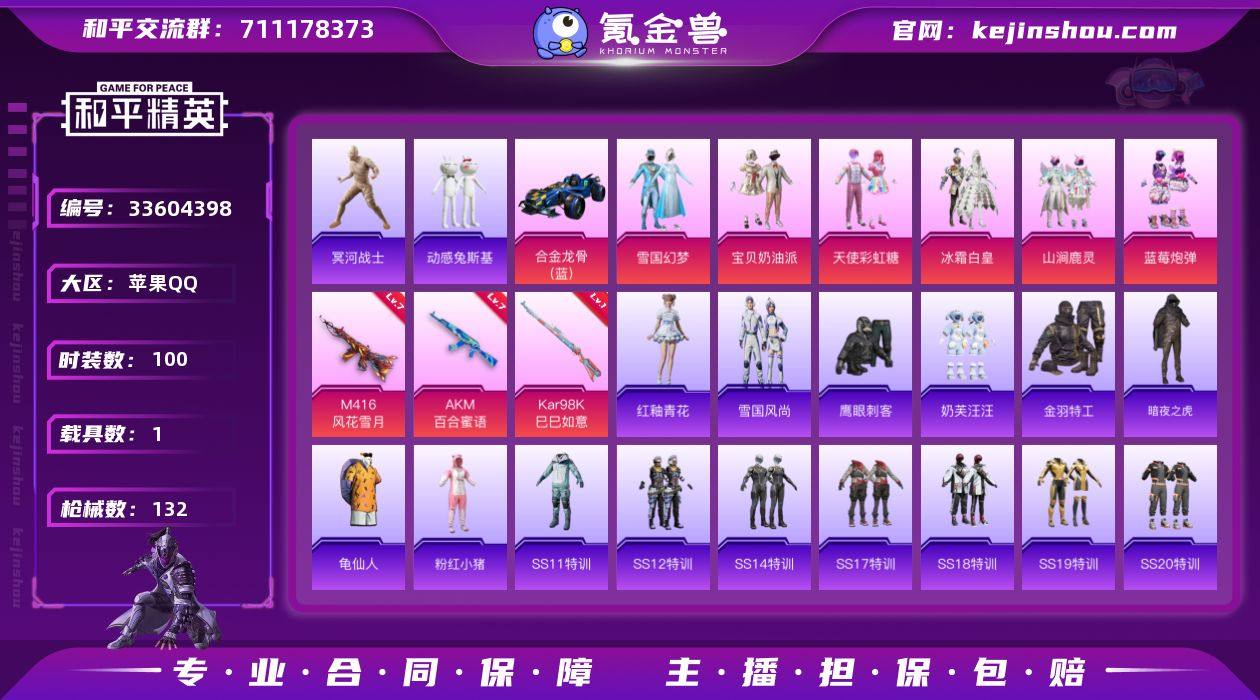 苹果 手Q-6粉装-3特效枪-1载具-0粉色飞行器-44100热力值-15王牌印记-100套装-132枪皮 【热门品类】:粉装-雪国幻梦,套装-冥河战士,套装-金羽特工,套装-动感兔斯基人偶服,套装-暗夜之虎,套装-龟仙人,套装-粉红小猪 【粉色套装】:粉装-宝贝奶油派,粉装-天使彩虹糖,粉装-雪国幻梦,粉装-冰霜白皇,粉装-山涧鹿灵,粉装-蓝莓炮弹 【粉色枪皮等级】:AKM-百合蜜语(七级),M416-风花雪月(七级),Kar98K-巳巳如意(一级) 【粉色载具】:合金龙骨(蓝) 【粉色枪皮】:AKM-百合蜜语,M416-风花雪月,Kar98K-巳巳如意 【粉色降落伞】:甜心宝贝降落伞,春暖花开降落伞,童趣迷兔降落伞,洛神天依降落伞,蓝莓炮弹降落伞,流星咚咚降落伞,天之羽翼降落伞,焦糖拿铁降落伞,旋转彩虹降落伞,蜜语绒猫降落伞,霁蓝缠春降落伞 【稀有套装】:套装-龟仙人,套装-雪国风尚,套装-雨过天青,套装-红釉青花 【稀有枪皮】:AKM-彩虹符号,AKM-影袭,AKM-星兔领航员,AKM-玉龙,AKM-王牌投手,AKM-霓虹街区,AKM-龙的传人,M16A4-冥河战士,M16A4-甜心亚梦,SCAR-L-暗夜玫瑰,SCAR-L-青丘仙客,M416-神秘黑猫,GROZA-异彩先驱,GROZA-影袭,GROZA-田园牧歌,GROZA-蓝莓炮弹,AUG-耀粉歌...