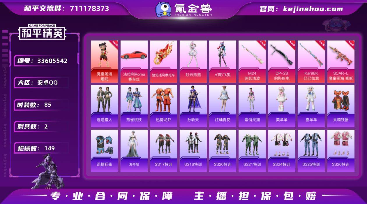 【LHPX2535】【特价出售/店主推荐/哪吒法拉利小号超值】安卓 手Q-1神装-2粉装-4特效枪-2载具-4粉色飞行器-44218热力值-2王牌印记-85套装-149枪皮 【红色神装等级】:魔童闹海-哪吒(二级) 【红色角色神装】:魔童闹海-哪吒 【粉色套装】:粉装-幻影飞狐,角色-虹云熊熊 【粉色枪皮等级】:SCAR-L-魔童闹海 哪吒(三级),Kar98K-巳巳如意(五级),M24-莲影清波(六级),DP-28-豹影疾电(五级) 【粉色载具】:法拉利Roma(赛车红),踏焰逐风摩托车 【粉色枪皮】:SCAR-L-魔童闹海 哪吒,Kar98K-巳巳如意,M24-莲影清波,DP-28-豹影疾电 【粉色飞行器】:炫彩糖果飞行器,飞天猪飞行器,冰狼掠影飞行器 【粉色降落伞】:莲影清波降落伞,千金淑猫降落伞,喜羊羊与灰太狼降落伞,魔童闹海 哪吒降落伞,炫彩糖果降落伞,霜月狼主降落伞 【稀有套装】:套装-迅捷龙虾,套装-遗迹猎人,角色-海琴烟,玩偶服-美羊羊,玩偶服-喜羊羊,角色-紫俏灵猫,套装-雨过天青,套装-红釉青花,角色-孙斩天,套装-燕雀桃枝 【稀有枪皮】:AKM-影袭,AKM-生命誓言,AKM-破晓战魂,AKM-霓虹街区,AKM-龙的传人,M16A4-幻世战舞者,SCAR-L-夜灯,SCAR-L-玉兔迎春,SCAR-L-粉锦千层,SCAR-L-龙宫之主,SCAR...