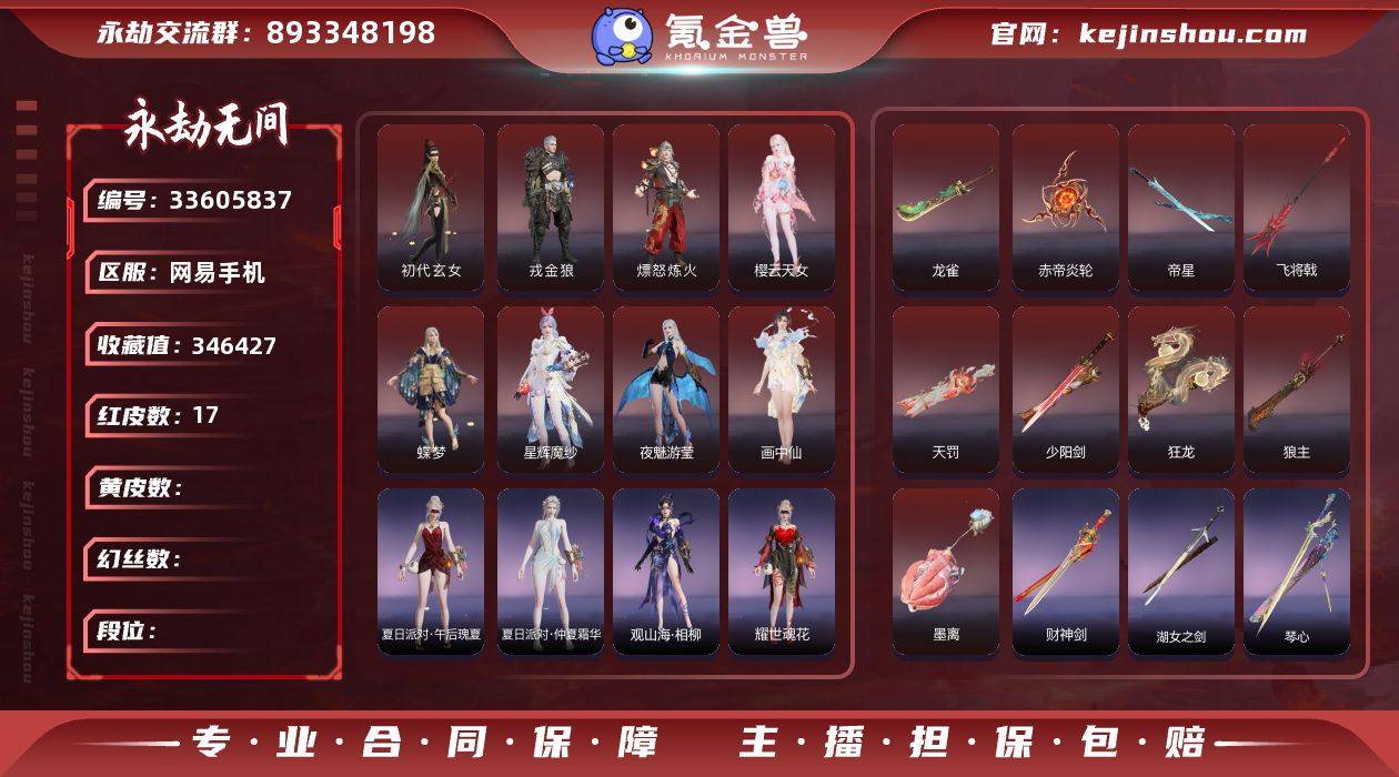 YJJ2355/5.12换绑/等级397/s20三人蚀月1/18红589金收藏值346427/18红色神品:/初代玄女/星辉魔纱/戎金狼/熛怒炼火/樱云天女/蝶梦/夜魅游莹/画中仙/征天白龙/少阳剑/帝星/狼主/龙雀/飞将戟/狂龙/赤帝炎轮/天罚/墨离/【技能奥义】/御祥云/荆魂/石龛造像/勾玉/神君印/炎烈珠 宁红夜:/初代玄女/昆仑之主/倒反阴阳炽羽/耀世魂花/山川润/相柳/午后瑰夏/九阴圣女/云霞发/双马尾女 沈妙:/星辉魔纱/秋藏桂/云溪仙子/楚韵九歌山鬼/悠竹萌客/奥村春NOIR/紫衣仙子/娇憨发/NOIR发型/双马尾女 天海:/九骊之君/觉明尊者/悟净/八宝龙王/自在发/双马尾男 殷紫萍:/风雨谐/萍之缘/鹅黄纱梦/春神句芒/瑶光沐月/暖绒发/双马尾女 特木尔:/戎金狼/唐三/街头梦语/沙狼之怒/追猎/海神发/双马尾男 季沧海:/熛怒炼火/鹧鸪天/杰洛特/康复之星/巨阙/江海发/含锋发/白狼发/双马尾男 胡桃:/樱云天女/蝶梦/小可/星空投影/道诡异仙李岁/紫藤神子/清雅少女/贵胄少女/御宅罗梦/太岁发/归宁发/双马尾女 妖刀姬:/暗夜利刃/御神之刃 崔三娘:/暗沼摩罗/汐泪/阿娜希塔/赤雾烟霞/填海发/冷傲发/双马尾女 岳山:/天渊御水/破荆者/铁面/汉光/过江龙/玄鳞发/靖仇发/双马尾男 无尘:/黄庭道/南风/申公豹/若谷/双马尾男 顾清寒:/...