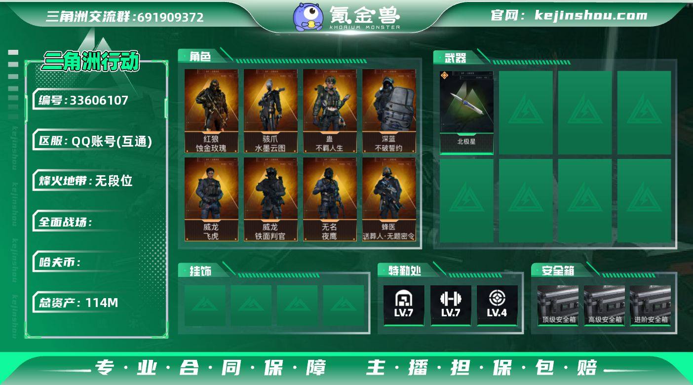 114m总资产【干员外观】:红狼蚀金玫瑰,威龙飞虎,威龙铁面判官,无名夜鹰,蜂医送葬人无题密令,蛊-不羁人生,深蓝不破誓约,骇爪水墨云图【近战皮肤】:北极星