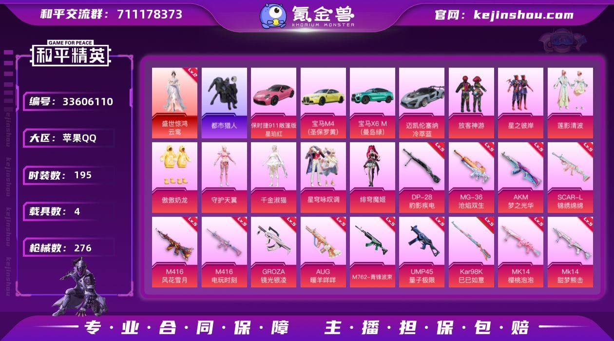 苹果 手Q-1神装-8粉装-17特效枪-4载具-12粉色飞行器-102925热力值-16王牌印记-195套装-276枪皮 【红色神装等级】:盛世惊鸿-云鸾(二级) 【红色角色神装】:盛世惊鸿-云鸾 【热门品类】:套装-浪漫天命,套装-都市猎人,套装-龟仙人,套装-暗影哥特,套装-红红火火,角色-Mark.06,套装-红熊茄茄 【粉色套装】:粉装-放客神游,粉装-星之彼岸,粉装-莲影清波,粉装-傲傲奶龙,角色-守护天翼,角色-千金淑猫,粉装-星穹咏叹调,角色-绯穹魔姬 【粉色枪皮等级】:AKM-梦之光华(五级),SCAR-L-锦绣绵绵(五级),M416-风花雪月(五级),M416-电玩时刻(五级),GROZA-镜光银凌(五级),AUG-暖羊咩咩(五级),M762-青锋波束(五级),UMP45-量子极限(五级),Kar98K-巳巳如意(五级),Mk14-樱桃泡泡(五级),Mk14-甜梦熊击(五级),AMR-智耀战神(五级),DP-28-千金淑猫(四级),DP-28-豹影疾电(五级),MG3-洛神天依(五级),MG-36-幻彩电音(五级),MG-36-沧焰双生(五级) 【粉色载具】:宝马M4(圣保罗黄),宝马X6 M(曼岛绿),迈凯伦塞纳(冷萃蓝),保时捷911 敞篷版(星珀红) 【粉色枪皮】:AKM-梦之光华,SCAR-L-锦绣绵绵,M416-风花雪月,M416-电玩时刻,GROZA-镜光银凌,AUG-暖羊咩咩,M76...