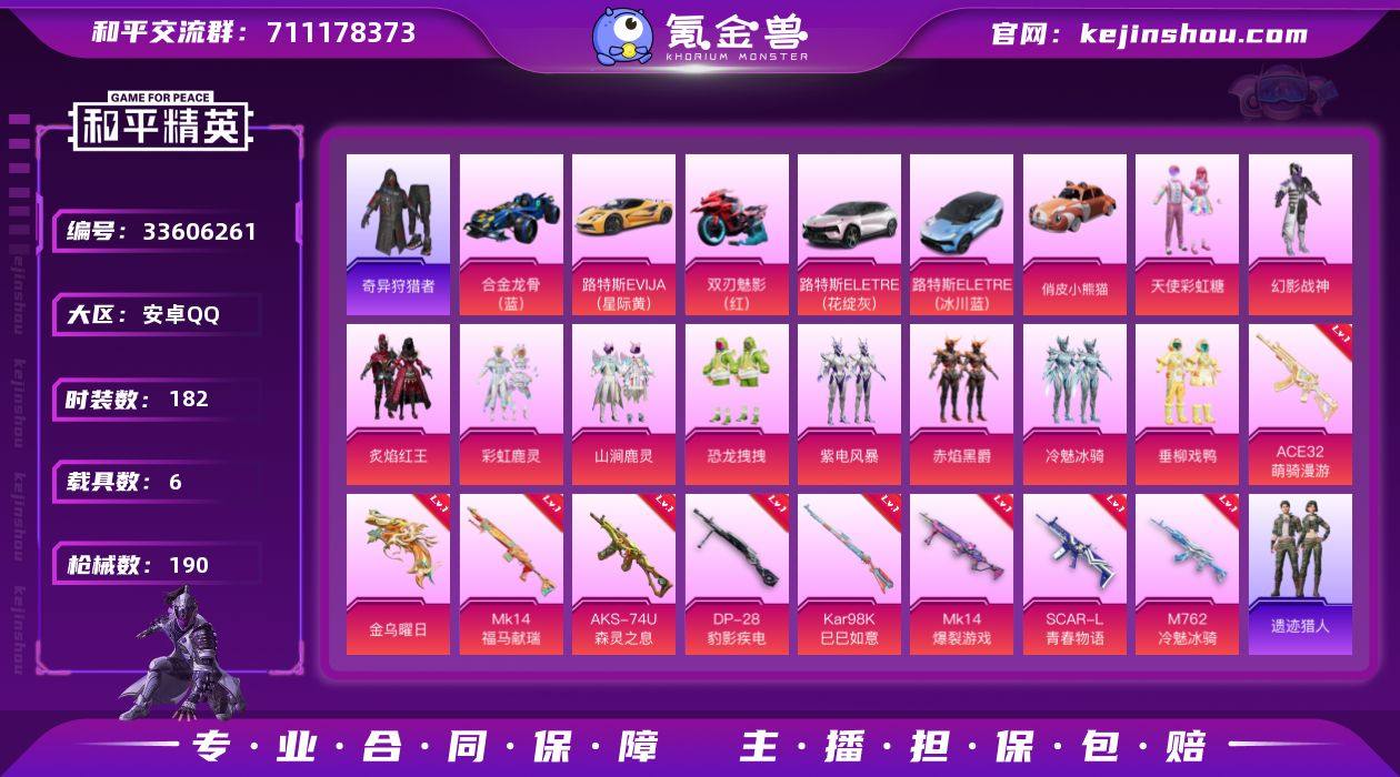 可二次【小熊背包6载具10粉装9特效枪 秒换绑不用等】 安卓Q区-68781热力值-182套装-190枪皮 【6载具】 路特斯ELETRE(冰川蓝) 路特斯EVIJA(星际黄) 合金龙骨(蓝) 双人摩托-双刃魅影(红) 路特斯ELETRE(花绽灰) 俏皮小熊猫【2稀有】 萌熊伴侣背包(小熊背包) 奇异狩猎者【10粉装】 天使彩虹糖 恐龙拽拽 垂柳戏鸭 彩虹鹿灵 山涧鹿灵 炙焰红王 紫电风暴 赤焰黑爵 冷魅冰骑 幻影战神【9特效枪】 AKS-74U-森灵之息(5级) Mk14-福马献瑞(5级) 信号枪-金乌曜日(4级) ACE32-萌骑漫游(5级) SCAR-L-青春物语(6级) M762-冷魅冰骑(7级) Mk14-爆裂游戏(5级) Kar98K-巳巳如意(5级) DP-28-豹影疾电(5级)【185热门】 浪漫天命 雪山精英(老6服) 小丑鱼 极速红龙 豚鼠丹丹 缤纷焰火 白色伏地魔 SS27特训 SS25特训 SS24特训 SS23特训 SS22特训 Mini14-梦幻火箭 M24-未来战士 AWM-雷霆特警 SCAR-L-玉兔迎春 GROZA-恐龙拽拽 AUG-幻影战神 M762-天降萌叽 Mk47-乌木金纹 UZI-娇憨猪猪 M416-夜灯 UMP45-蓝色火焰 S12K-垂柳戏鸭 M249-彩虹符号 MG3-幻世战舞者 AKM-霓虹街区 M416-紫翼圣骑 鹰眼刺客 GROZA-异彩先驱 GROZA-蓝莓炮弹 破蛋小黄鸡 长空猛禽 异彩先驱 虚音幻奏 夏日倾情 甜心亚梦 特训学院 青...