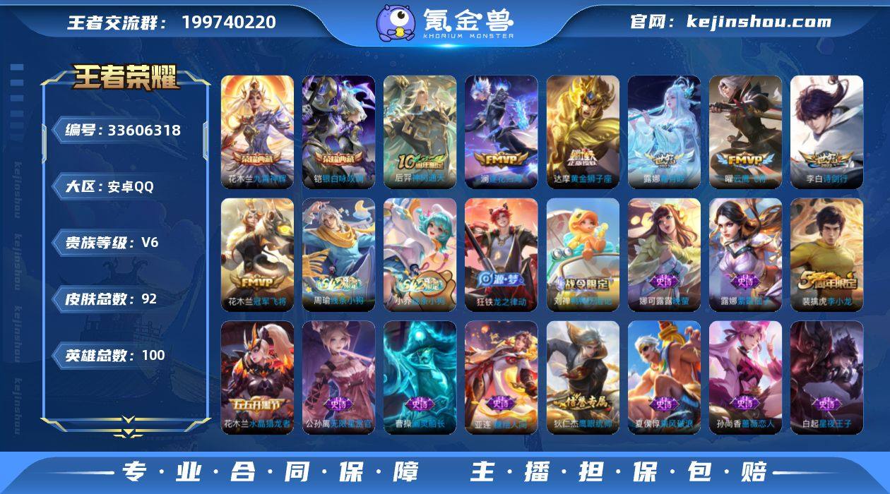 安卓Q-V6-至尊星耀IV段位-100英雄-92皮肤-2典藏皮肤-8传说-31史诗【荣耀典藏】:花木兰九霄神辉,铠银白咏叹调【传说皮肤】:花木兰异界灵契,后羿神树通天,澜逐花归海,露娜霜月吟,李白诗剑行,曜云鹰飞将,达摩黄金狮子座,花木兰冠军飞将【限定皮肤】:狄仁杰阴阳师,赵云皇家上将,孙尚香蔷薇恋人,狄仁杰魔术师,项羽海滩派对,雅典娜单词大作战,裴擒虎李小龙,鬼谷子天穹祈灯,刘邦剑破天穹【赛季限定】:鬼谷子天穹祈灯,刘邦剑破天穹,太乙真人谧流熔炉,钟馗虚灵犬护,甄姬逆浪荇歌,亚瑟荣光之誓【战令限定】:雅典娜单词大作战,孙膑茶境仙,马超访茗客,刘禅鸭鸭历险记,沈梦溪鸭鸭历险记,周瑜线条小狗,小乔线条小狗【史诗皮肤】:周瑜线条小狗,小乔线条小狗,狂铁龙之律动,刘禅鸭鸭历险记,亚连糖绘人间,孙膑茶境仙,裴擒虎李小龙,娜可露露晚萤,公孙离无限星赏官,狄仁杰鹰眼统帅,孙策猫狗日记,白起星夜王子,李元芳逐浪之夏,雅典娜冰冠公主,亚瑟心灵战警,兰陵王暗隐猎兽者,小乔缤纷独角兽,夏侯惇乘风破浪,花木兰水晶猎龙者,曹操幽灵船长,墨子龙骑士,妲己魅力维加斯,嬴政摇滚巨星,孙尚香水果甜心,孙尚香蔷薇恋人,宫本武藏鬼剑武藏,廉...