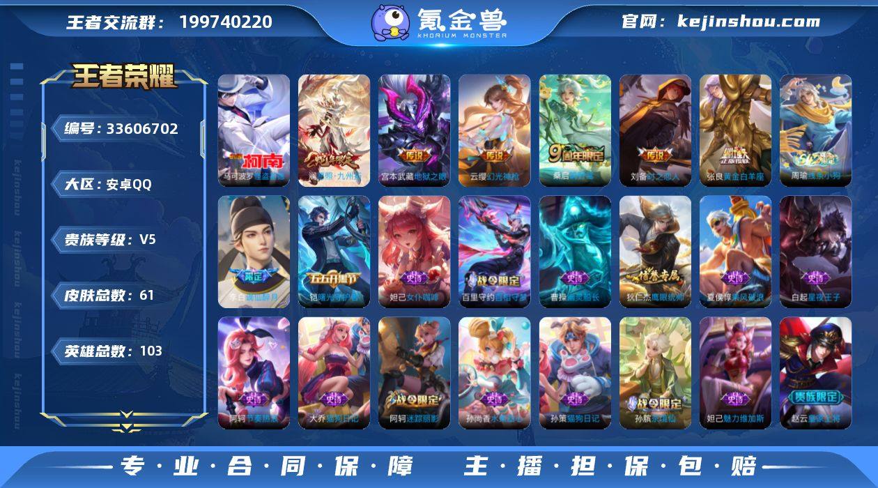 安卓Q-V5-尊贵铂金II段位-103英雄-61皮肤-1珍品传说-7传说-17史诗【珍品传说】:马可波罗怪盗基德【传说皮肤】:关羽神骥镇沧海,澜愿照九州拓,云缨幻光神枪,桑启鸣野蒿,刘备时之恋人,张良黄金白羊座,宫本武藏地狱之眼【限定皮肤】:李白谪仙醉月,狄仁杰阴阳师,赵云皇家上将,阿轲迷踪丽影,项羽海滩派对【年限皮肤】:澜愿照九州拓【赛季限定】:东皇太一噬灭天穹,太乙真人谧流熔炉,钟馗虚灵犬护【战令限定】:阿轲迷踪丽影,百里守约百相守梦,老夫子百相守梦,孙膑茶境仙,马超访茗客,周瑜线条小狗【史诗皮肤】:周瑜线条小狗,孙膑茶境仙,百里守约百相守梦,李白谪仙醉月,沈梦溪月团寄思,阿轲迷踪丽影,狄仁杰鹰眼统帅,大乔猫狗日记,孙策猫狗日记,阿轲节奏热浪,白起星夜王子,铠曙光守护者,夏侯惇乘风破浪,曹操幽灵船长,妲己女仆咖啡,妲己魅力维加斯,孙尚香水果甜心,赵云皇家上将【其他皮肤】:阿古朵布丁狗之约,钟馗虚灵犬护,刘备浪漫序章,戈娅玫蓝誓约,明世隐景韶洛都,少司缘灵卦秘语,马超访茗客,典韦铁骨偃魂,太乙真人谧流熔炉,苍苍林狼骑,吕布逐霄战戟,干将莫邪雾都夜雨,老夫子百相守梦,东皇太一噬灭天穹,亚连破局者,鬼谷子幻...