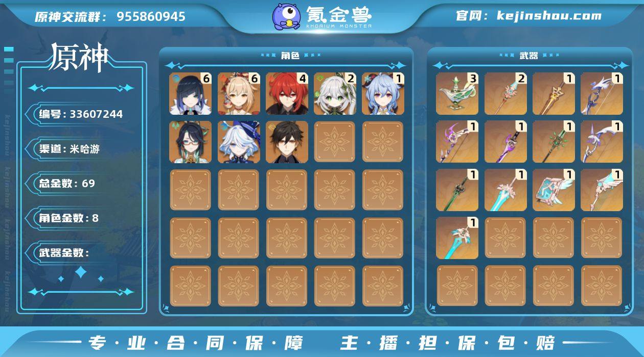 69黄 风元素:0命闲云, 0命枫原万叶 火元素:6命宵宫, 0命胡桃 水元素:6命夜兰, 0命芙宁娜, 1命妮露 雷元素:3命雷电将军 冰元素:1命甘雨, 0命神里绫华 岩元素:0命钟离, 0命娜维娅 草元素:2命纳西妲 【常驻五星角色及命座】 风元素:2命琴 火元素:4命迪卢克, 0命迪希雅 水元素:2命莫娜 雷元素:2命刻晴 冰元素:0命七七 草元素:0命提纳里 单手剑:精1圣显之钥, 精1天空之刃, 精1磐岩结绿, 精1雾切之回光, 精1静水流涌之辉 双手剑:精1天空之傲 长柄武器:精1和璞鸢, 精2天空之脊, 精2薙草之稻光 法器:精3千夜浮梦, 精1天空之卷, 精1碧落之珑 弓:精1天空之翼, 精1若水, 精1阿莫斯之弓, 精1飞雷之弦振 【角色皮肤】 五星角色:刻晴-霓裾翩跹, 神里绫华-花时来信, 琴-海风之梦 四星角色:凯亚-帆影游风, 丽莎-叶隐芳名