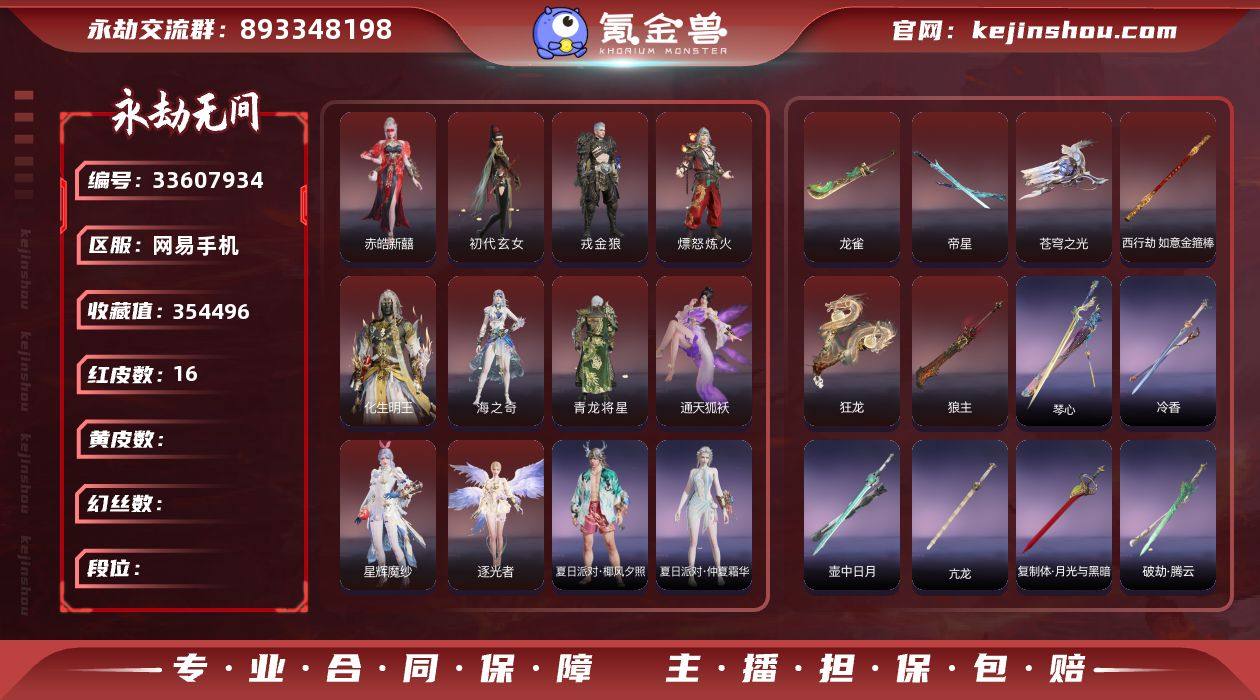 YJJ2358/5.12换绑/等级472/s20三人蚀月2/20红605金收藏值354496/20红色神品:/赤皓新囍/初代玄女/星辉魔纱/化生明王/戎金狼/熛怒炼火/人偶之梦/海之奇/青龙将星/通天狐袄/逐光者/帝星/狼主/龙雀/如意金箍棒/五行相/狂龙/龙骧/苍穹之光/【技能奥义】/珥冰/春木/荆魂/御祥云/勾玉/D.Va小兔徽章/炎烈珠 【武技外观】/穿仙洞·绯/仙洞十三迹·霞飞/破重霄·焰/雪严七重凛·寒梅 宁红夜:/赤皓新囍/初代玄女/倒反阴阳炽羽/碧水青天/紫金玉女/双马尾女 沈妙:/星辉魔纱/秋藏桂/悠竹萌客/楚韵九歌山鬼/奥村春NOIR/紫衣仙子/娇憨发/NOIR发型/双马尾女 天海:/化生明王/九骊之君/白熊/觉明尊者/若水尊者/伏龙尊者/八宝龙王/缘觉发/双马尾男 殷紫萍:/风雨谐/长夏清澜/福寿仙/鹅黄纱梦/萍之缘/暖绒发/双马尾女 特木尔:/戎金狼/啸天狼/沙暴苍狼/路奇迷踪/追猎/双马尾男 季沧海:/熛怒炼火/不良人李星云/鹧鸪天/康复之星/巨阙/椰风夕照/食神/信手斩龙/精武魂/江海发/烈火发/炮炼发/含锋发/不如吾发/白狼发/双马尾男 胡桃:/软暖甜梦/紫藤神子/御宅罗梦/清雅少女/樱舞发/木棉发/归宁发/双马尾女 妖刀姬:/人偶之梦/暗夜利刃 崔三娘:/海之奇/汐泪/暗沼摩罗/鸢纱/无拘/赤雾烟霞/冷傲发/双马尾女 岳山:/青...