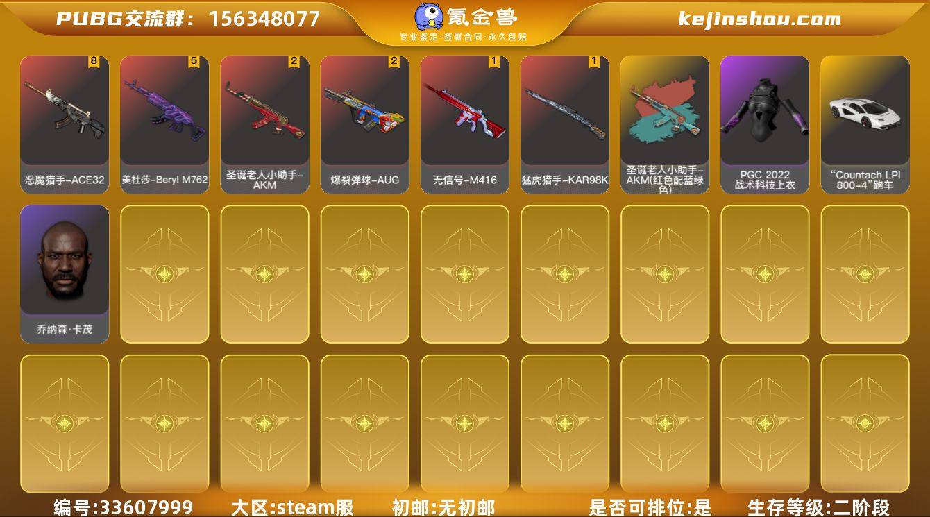JDPX13891 生存500级可排位/8级恶魔猎手-ACE32/2级爆裂弹球-AUG/5级美杜莎-BerylM762/2级圣诞老人小助手-AKM/圣诞老人小助手-AKM(红色配蓝绿色)/1级无信号-M416/无信号-M416(黄色配黑色)/1级猛虎猎手-KAR98K/兰博基尼跑车/发光手臂/品红色烟雾弹/黑鬼/金面具/白熊鞋/粉色电磁包/ 0BH6I9号 无排名, 生存等级989, 名誉等级4, 金标数量3, 图纸1, 聚合物1000, 枪皮数量118, [成长型] 恶魔猎手 - ACE32[8级], [成长型] 圣诞老人小助手 - AKM[2级], [成长型] 爆裂弹球 - AUG[2级], “Countach LPI 800-4” 跑车