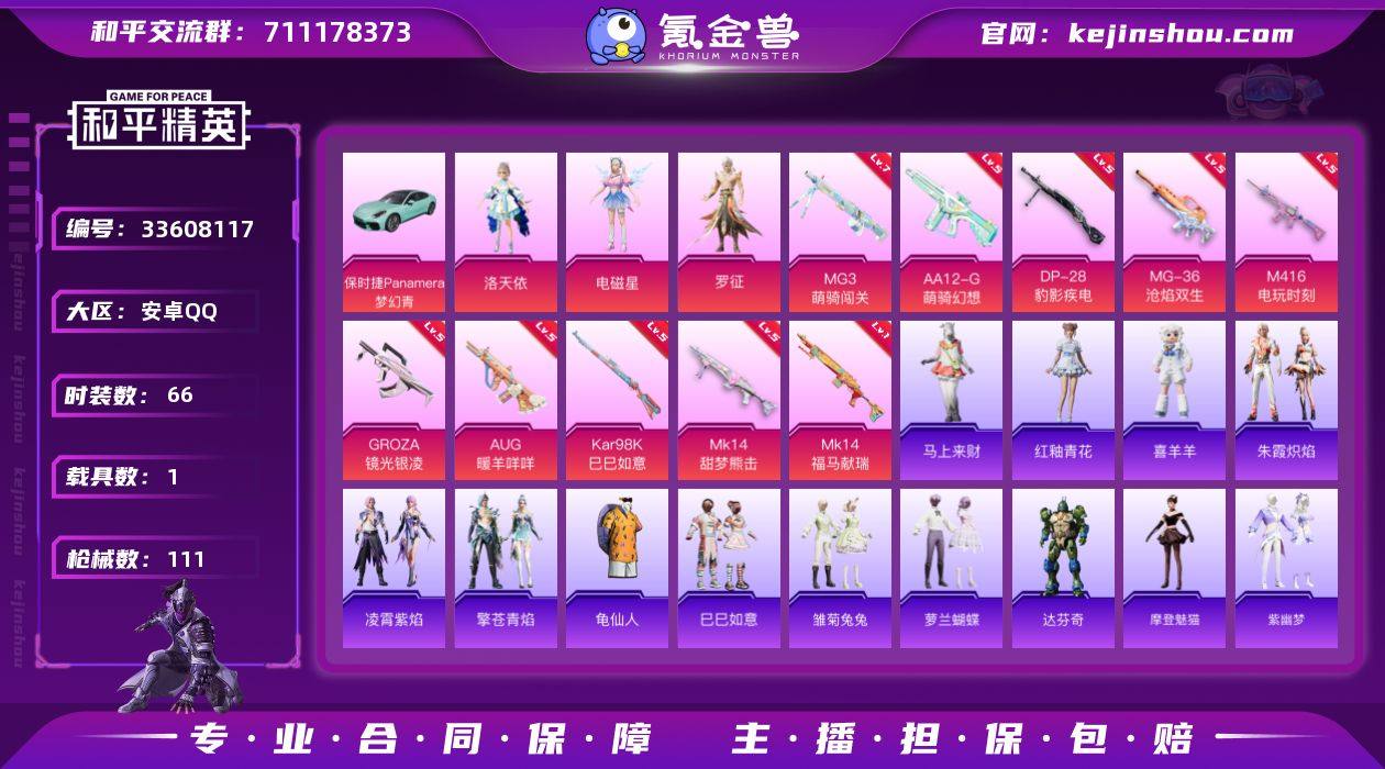 【kyhp2074】安卓 手Q-3粉装-10特效枪-1载具-1粉色飞行器-32215热力值-1王牌印记-66套装-111枪皮 【热门品类】:套装-龟仙人 【粉色套装】:角色-洛天依,角色-电磁星,角色-罗征 【粉色枪皮等级】:M416-电玩时刻(五级),GROZA-镜光银凌(五级),AUG-暖羊咩咩(五级),Kar98K-巳巳如意(五级),Mk14-甜梦熊击(五级),Mk14-福马献瑞(一级),AA12-G-萌骑幻想(五级),DP-28-豹影疾电(五级),MG3-萌骑闯关(七级),MG-36-沧焰双生(五级) 【粉色载具】:保时捷Panamera(梦幻青) 【粉色枪皮】:M416-电玩时刻,GROZA-镜光银凌,AUG-暖羊咩咩,Kar98K-巳巳如意,Mk14-甜梦熊击,Mk14-福马献瑞,AA12-G-萌骑幻想,DP-28-豹影疾电,MG3-萌骑闯关,MG-36-沧焰双生 【粉色飞行器】:炫彩糖果飞行器 【粉色降落伞】:洛神天依降落伞,第五大道降落伞,精灵梦叶罗丽降落伞,炫彩糖果降落伞 【稀有套装】:套装-龟仙人,套装-巳巳如意,套装-炫彩糖果,套装-马上来财,套装-雏菊兔兔,套装-萝兰蝴蝶,角色-达芬奇,角色-摩登魅猫,套装-紫幽梦,套装-蓝冰羽,套装-星影赞美诗,套装-朱霞炽焰,套装-凌霄紫焰,套装-擎苍青焰,玩偶服-喜羊羊,套装-雨过天青,套装-红釉青花 【稀有枪皮】:AUG-...