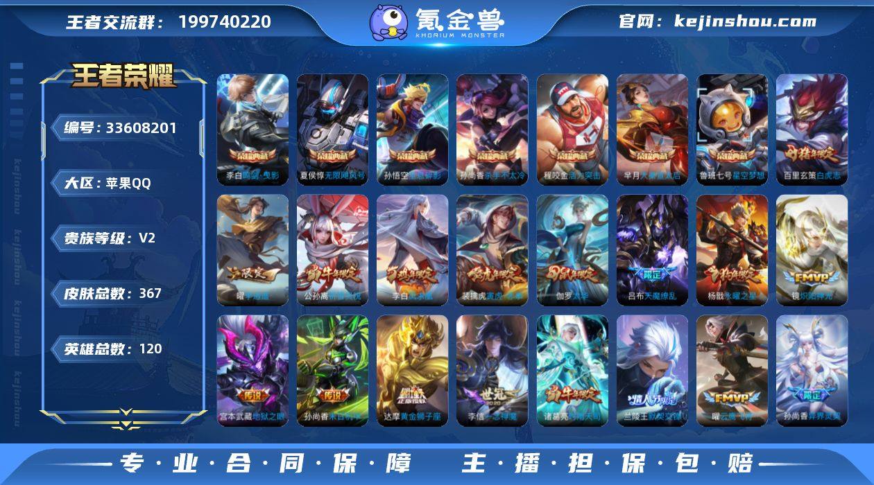 4金标,3星传说,7典藏.0违规,可二次,苹果Q-V10-荣耀黄金IV段位-120英雄-367皮肤-7典藏皮肤-36传说-132史诗 【英雄全皮】:猪八戒全皮,空空儿全皮 【荣耀典藏】:孙悟空全息碎影,夏侯惇无限飓风号,孙尚香杀手不太冷,鲁班七号星空梦想,芈月大秦宣太后,程咬金活力突击,李白鸣剑曳影 【传说皮肤】:艾琳觅芳踪,裴擒虎寅虎赤拳,鲁班七号寅虎瑞焰,孙尚香异界灵契,貂蝉遇见胡旋,王昭君乞巧织情,西施游龙清影,曜李逍遥 ,李元芳飞鸢探春,兰陵王默契交锋,公孙离祈雪灵祝,诸葛亮时雨天司,铠绛天战甲,镜炽阳神光,虞姬启明星使,孙悟空零号赤焰,关羽武圣,曜云鹰飞将,李信一念神魔,刘备时之恋人,伽罗太华,貂蝉猫影幻舞,张良黄金白羊座,虞姬云霓雀翎,达摩黄金狮子座,百里玄策白虎志,花木兰冠军飞将,后羿黄金射手座,杨戬永曜之星,貂蝉仲夏夜之梦,李白凤求凰,孙尚香末日机甲,宫本武藏地狱之眼,孙悟空地狱火,吕布天魔缭乱,狄仁杰超时空战士 【限定皮肤】:狄仁杰阴阳师,小乔纯白花嫁,廉颇寅虎御盾,赵云皇家上将,赵云龙胆,墨子神迹守卫,妲己时之彼端,嬴政白昼王子,孙尚香蔷薇恋人,孙尚香异界灵契,鲁班七号乒乒小将,鲁班七号寅虎瑞焰,庄...