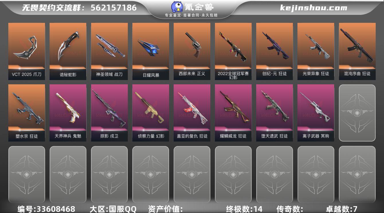 【958587】【套装】:VCT 2025 赛季套装 【英雄】:幻棱,炼狱,维斯,暮蝶,钛狐,壹决,铁臂,捷风,雷兹,幽影,不死鸟,贤者,猎枭,蝰蛇,零,芮娜,奇乐,尚勃勒,霓虹,斯凯,夜露,星礈,K/O,海神,盖可,黑梦,钢锁 【近战武器】:近战武器-影钩,近战武器-VCT 2025 爪刀,近战武器-鬼丸国纲,近战武器-未来开拓者,近战武器-夜刃诡镰,近战武器-诡秘蛇影 军刀,近战武器-神圣领域 战刀,近战武器-日耀风暴 遗器 【狂徒】:狂徒-混沌序曲,狂徒-塑水宗,狂徒-创·纪元,狂徒-光荣异象,狂徒-堕天遗武,狂徒-盖亚的复仇,狂徒-耀鳞威龙,狂徒-诡秘蛇影 【幻影】:幻影-2022全球冠军赛,幻影-侦察力量,幻影-神圣领域,幻影-末日之翼 【戍卫】:戍卫-掠影,戍卫-月球哨兵,戍卫-折光棱晶 【獠犬】:獠犬-神圣领域 【冥驹】:冥驹-离子武器,冥驹-星云暗涌 【飞将】:飞将-末日之翼 【莽侠】:莽侠-诡秘蛇影,莽侠-月球哨兵 【战神】:战神-神圣领域 【奥丁】:奥丁-末日之翼 【判官】:判官-诡秘蛇影 【雄鹿】:雄鹿-月球哨兵 【骇灵】:骇灵-无限竞技,骇灵-星云暗涌 【蜂刺】:蜂刺-星云暗涌,蜂刺-折光棱晶 【标配】:标配-折光棱晶 【正义】:正义-西部未来,正义-...