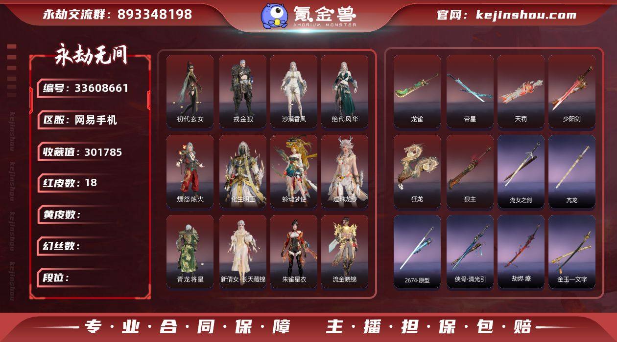 YJJ2359/5.12换绑/等级417/s20三人黄金1/18红445金收藏值301785/18红色神品:/初代玄女/朱雀星衣/化生明王/长天藏锦/戎金狼/熛怒炼火/蛉魂梦使/泣珠龙纱/青龙将星/绝代风华/沙漠香风/流金晓锦/少阳剑/帝星/狼主/龙雀/狂龙/天罚/【技能奥义】/荆魂/霜翎/御祥云/竹韵悠/噬骨/凶虎 宁红夜:/初代玄女/耀世魂花/相柳/玄豹姿/紫金玉女/泠川发/云霞发/双马尾女 沈妙:/朱雀星衣/涂鸦少女/絮云衣/紫衣仙子/腓腓/百灵发/双马尾女 天海:/化生明王/觉明尊者/持威明王/若水尊者/八宝龙王/自在发/缘觉发/双马尾男 殷紫萍:/长天藏锦/风雨谐/春神句芒/萍之缘/沐昭/瑶光沐月/流纨裙/紫芙发/子菀发/苏木发/伏苓发/双马尾女 特木尔:/戎金狼/唐三/噬月天狼/沙狼之怒/追猎/海神发/双马尾男 季沧海:/熛怒炼火/巨阙/龙心炽焰/杰洛特/街头烈火/瑞火麟/江海发/白狼发/含锋发/双马尾男 胡桃:/山吹茶/遣唐使/辉烨少女/清雅少女/至纯/樱舞发/月下香发/双马尾女 妖刀姬:/蛉魂梦使/樱雨刀舞 崔三娘:/泣珠龙纱/伏波龙女/阿娜希塔/赤雾烟霞/巨鲸客/怒浪/安澜发/碎浪发/鲸海发/双马尾女 岳山:/青龙将星/弘毅袍/常胜袍/过江龙/双马尾男 无尘:/灵鹿巫者/申公豹/柳生/幽篁山鬼/司天命/清威发/竹律发/双马尾男 顾清寒...
