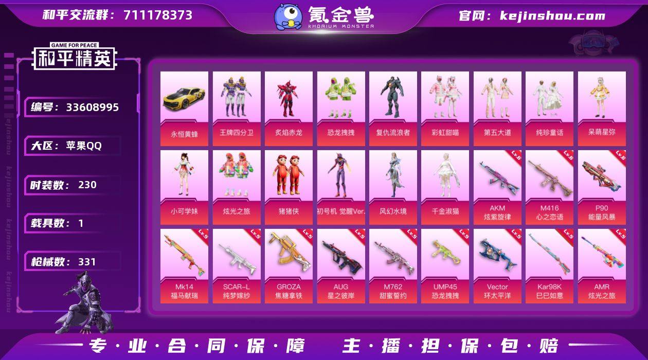苹果 手Q-14粉装-17特效枪-1载具-5粉色飞行器-105225热力值-17王牌印记-230套装-331枪皮 【热门品类】:套装-浪漫天命,套装-小丑鱼,角色-军刀雅典娜,套装-龟仙人,套装-暗影哥特,套装-粉红小猪,角色-8号机,角色-Mark.06 【粉色套装】:粉装-王牌四分卫,粉装-炙焰赤龙,粉装-恐龙拽拽,角色-复仇流浪者,粉装-彩虹甜喵,粉装-第五大道,粉装-纯珍童话,角色-呆萌星弥,角色-小可学妹,粉装-炫光之旅,玩偶服-猪猪侠,角色-初号机 觉醒Ver.,角色-风幻水境,角色-千金淑猫 【粉色枪皮等级】:AKM-炫紫旋律(六级),SCAR-L-纯梦嫁纱(五级),M416-心之恋语(六级),GROZA-焦糖拿铁(五级),AUG-星之彼岸(五级),AUG-妙趣可丽(一级),M762-甜蜜誓约(五级),ACE32-萌骑漫游(二级),UMP45-恐龙拽拽(五级),Vector-环太平洋(五级),AKS-74U-森灵之息(四级),P90-能量风暴(六级),Kar98K-巳巳如意(五级),Mk14-福马献瑞(五级),AMR-炫光之旅(五级),DP-28-豹影疾电(四级),MG3-梦幻舞会(五级) 【粉色载具】:永恒黄蜂 【粉色枪皮】:AKM-炫紫旋律,SCAR-L-纯梦嫁纱,M416-心之恋语,GROZA-焦糖拿铁,AUG-星之彼岸,AUG-妙趣可丽,M762-甜蜜誓约,ACE32-萌骑漫游,UMP45-恐龙拽拽,V...
