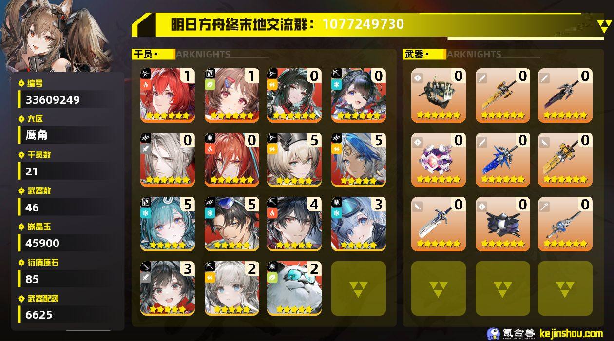 权限等阶57, 17橙(角色8, 武器9), 6个六星干员, 9把六星武器, 85个衍质源石, 45900个嵌晶玉, 协议定制10级, 武库配额6625, 其他角色武器详情看图.