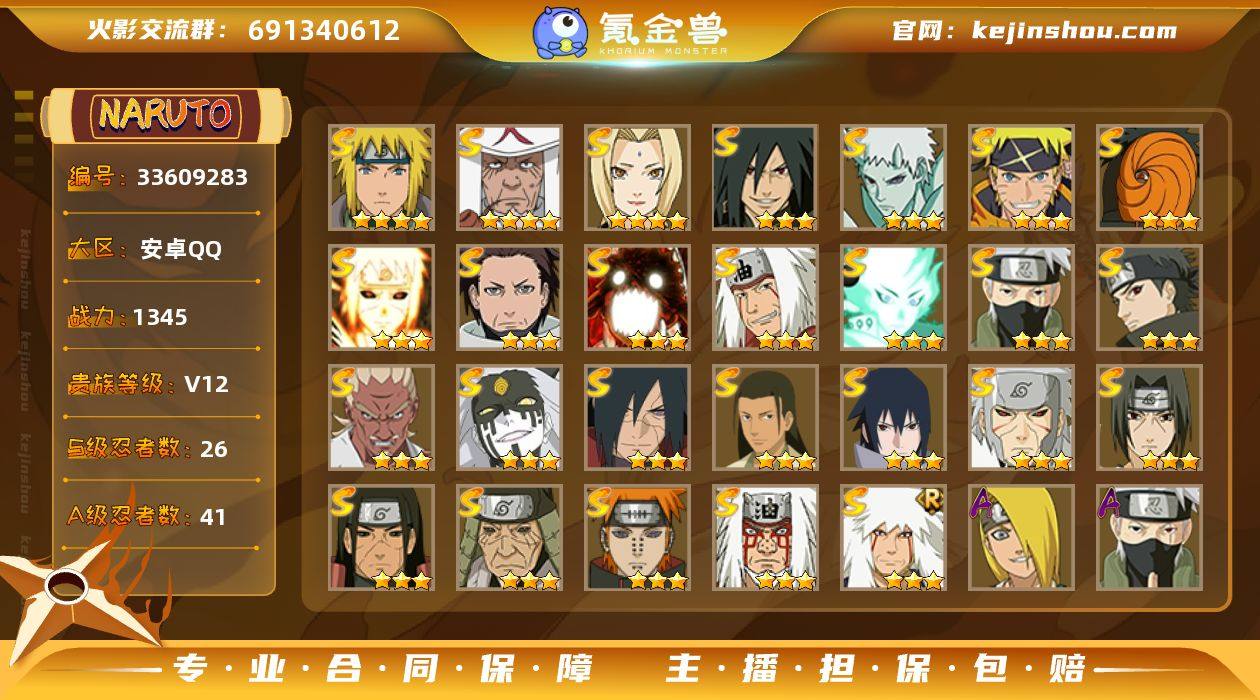 【火影忍者】战斗力:1345W+;段位:上忍3阶;本服排名:49;VIP:V12级;S忍:26个;A忍:41个;通灵兽:22个,S忍:十尾人柱力宇智波带土|秽土转生解宇智波斑|须佐能乎旗木卡卡西|秽土转生千手扉间|九喇嘛连结波风水门|五影会谈宇智波斑|天道佩恩|传说中的三忍自来也|漩涡鸣人宇智波佐助|须佐能乎宇智波止水|秽土转生千手柱间|永恒万花筒宇智波佐助|最终章大筒木舍人|仙人模式自来也|木叶创立千手柱间|忍界大战艾|舞之豪杰自来也|纲手(普通) * 4星|波风水门 * 4星|神驹佑将宇智波斑|须佐能乎宇智波鼬|大筒木桃式|猿飞日斩(普通) * 4星|秽土转生猿飞日斩|暴怒第六尾漩涡鸣人|初代目风影烈斗__A忍:青春爆炸迈特凯|仙人模式巳月|忍界大战李洛克|新春限定我爱罗|秽土转生角都|忍界大战日向宁次|新春限定宇智波止水|青年波风水门|漂泊武士千手扉间|近松十人卫千代|半蛇斗篷药师兜|新春限定小南|暴怒宇智波带土|忍界大战秋道丁次|疾风传咒印宇智波佐助|万花筒写轮眼宇智波佐助|达鲁伊(普通)|死司凭血飞段|疾风传我爱罗 * 3星|迪达拉(普通)|晓创生迪达拉|飞段(普通)|漂泊浪客小南|神驹佑将小南|神威对决旗木卡卡西|迈特凯(普通) * 5星|宇智波鼬(普通)|干柿鬼鲛(普通...