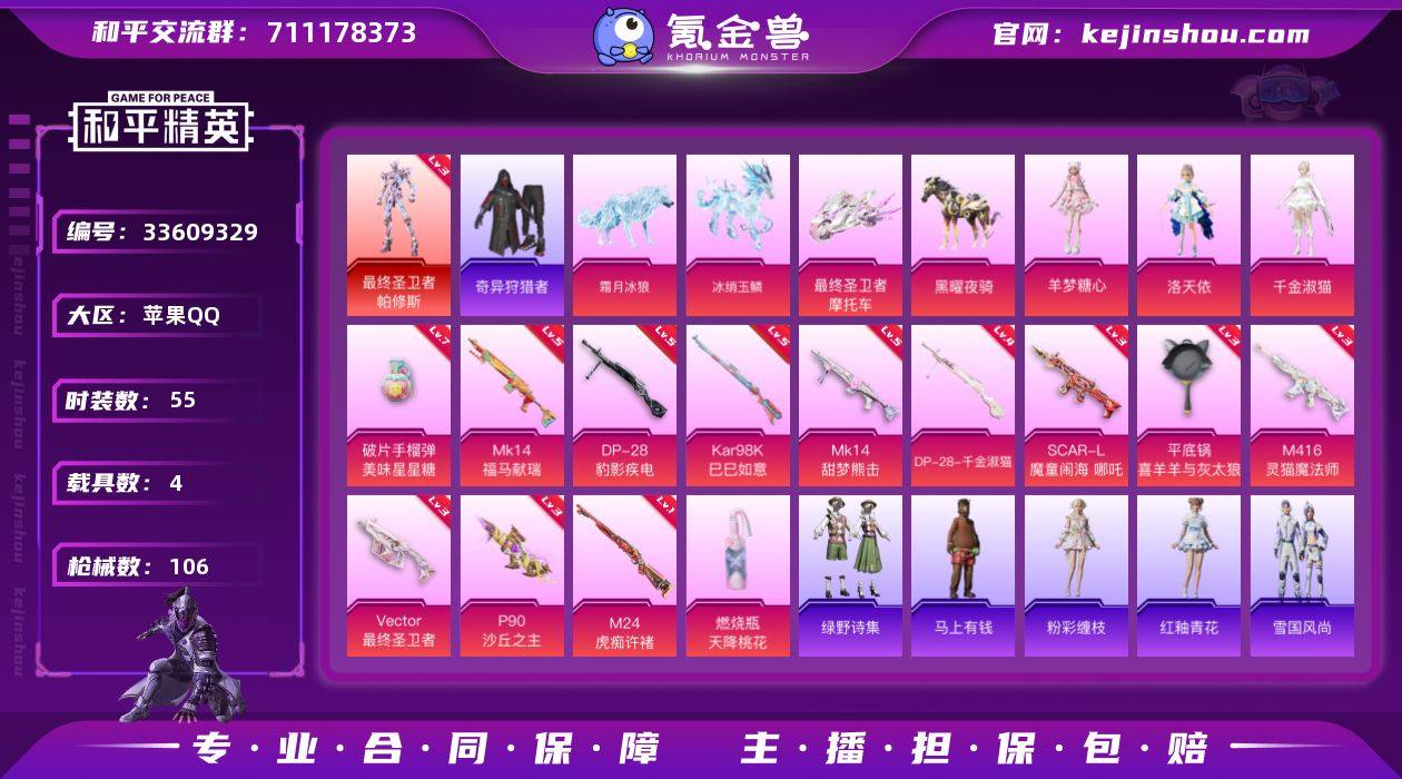 【kyhp1525】苹果 手Q-1神装-3粉装-13特效枪-4载具-6粉色飞行器-41061热力值-4王牌印记-55套装-106枪皮 【红色神装等级】:最终圣卫者-帕修斯(三级) 【红色角色神装】:最终圣卫者-帕修斯 【热门品类】:套装-小丑鱼,套装-奇异狩猎者 【粉色套装】:角色-洛天依,角色-千金淑猫,角色-羊梦糖心 【粉色枪皮等级】:SCAR-L-魔童闹海 哪吒(三级),M416-灵猫魔法师(三级),Vector-最终圣卫者(三级),P90-沙丘之主(三级),Kar98K-巳巳如意(五级),M24-虎痴许褚(一级),Mk14-甜梦熊击(五级),Mk14-福马献瑞(五级),DP-28-千金淑猫(四级),DP-28-豹影疾电(五级),平底锅-喜羊羊与灰太狼(三级),燃烧瓶-天降桃花(五级),破片手榴弹-美味星星糖(七级) 【粉色载具】:最终圣卫者摩托车,黑曜夜骑,冰绡玉鳞,霜月冰狼 【粉色枪皮】:SCAR-L-魔童闹海 哪吒,M416-灵猫魔法师,Vector-最终圣卫者,P90-沙丘之主,Kar98K-巳巳如意,M24-虎痴许褚,Mk14-甜梦熊击,Mk14-福马献瑞,DP-28-千金淑猫,DP-28-豹影疾电,平底锅-喜羊羊与灰太狼,燃烧瓶-天降桃花,破片手榴弹-美味星星糖 【粉色飞行器】:炫彩糖果飞行器,终晖之翼飞行器,灵猫魔法师飞行器,飞天猪飞行器,冰狼掠影飞行器 【粉色...