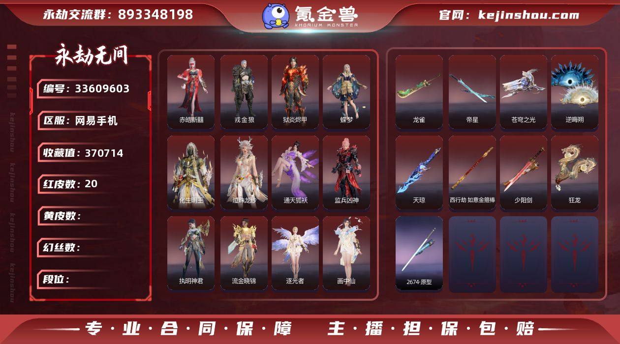 YJJ2364/365换绑/等级377/s20三人白银1/21红525金收藏值370714/赤皓新囍/化生明王/戎金狼/狱炎烬甲/蝶梦/人偶之梦/泣珠龙纱/监兵凶神/通天狐袄/执明神君/流金晓锦/逐光者/画中仙/苍穹之光/少阳剑/帝星/龙雀/西行劫·如意金箍棒/天琼/逆晦朔/狂龙/2674·原型/星辉环月/2674·初代机/珥冰/御翔云/洛天依·星轨引航//龙之影·过江龙//荆魂/拳皇·勾玉/夜蔷薇/幻丝332374/未绑定手游